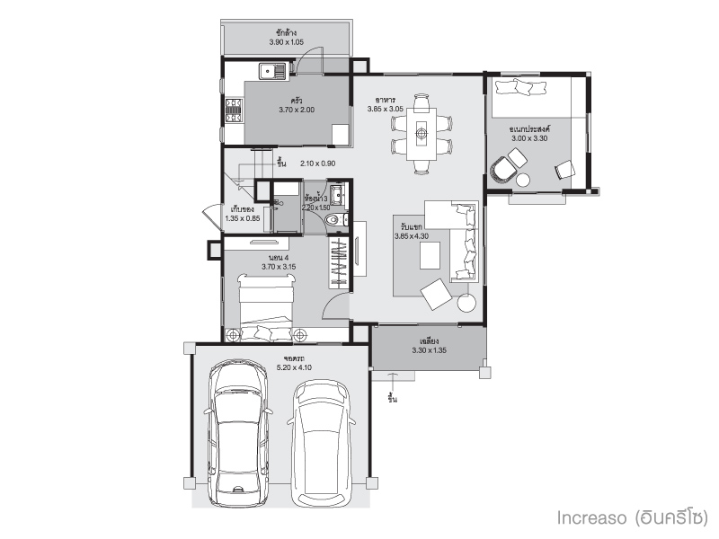 แบบบ้าน Increaso ขนาดที่ดิน 66 ตารางวา พื้นที่ใช้สอย 172 ตารางเมตร 4 ห้องนอน 3 ห้องน้ำ 1ห้องอเนกประสงค์และ 2 ที่จอดรถ เป็นแบบบ้านขนาดเล็กสุด ราคาเริ่มต้นที่ 8.99 ล้าน