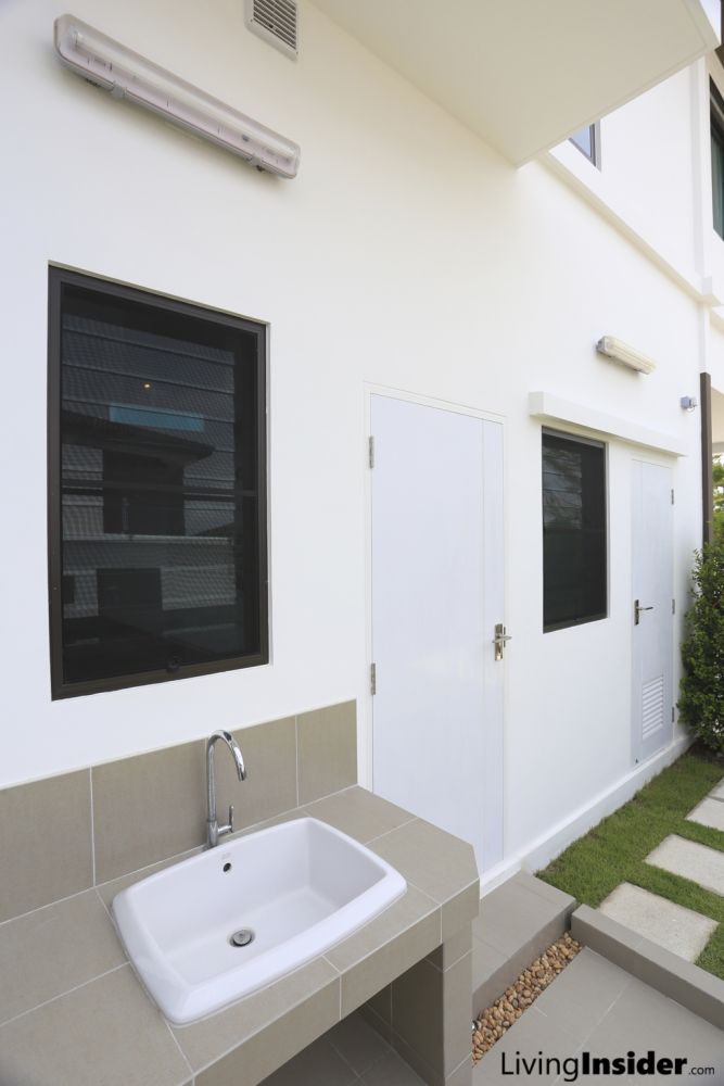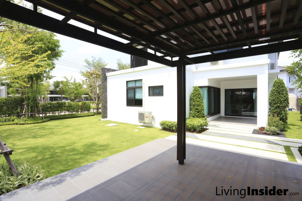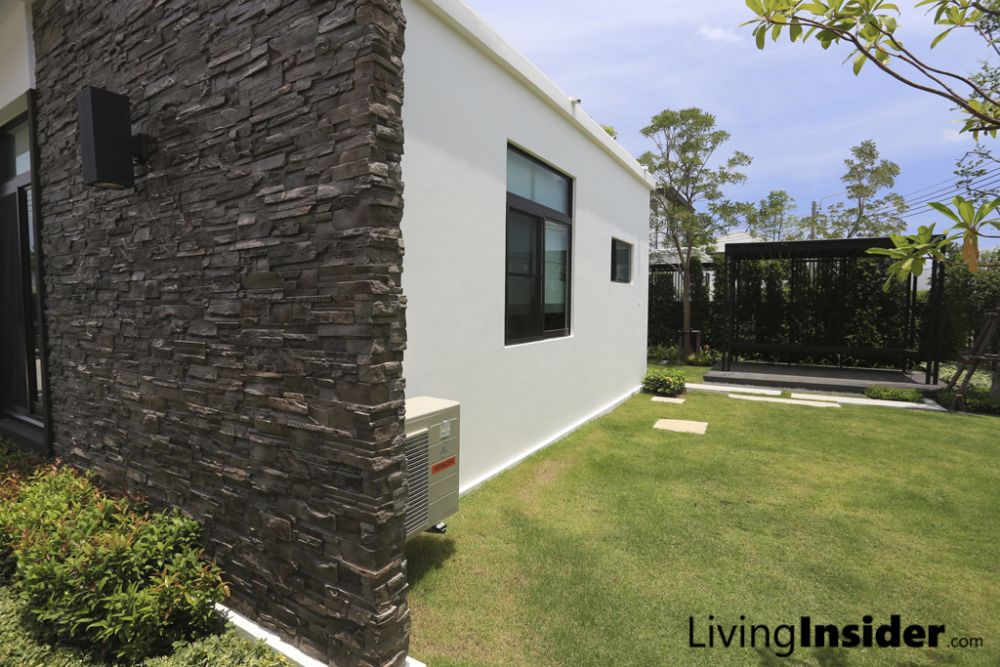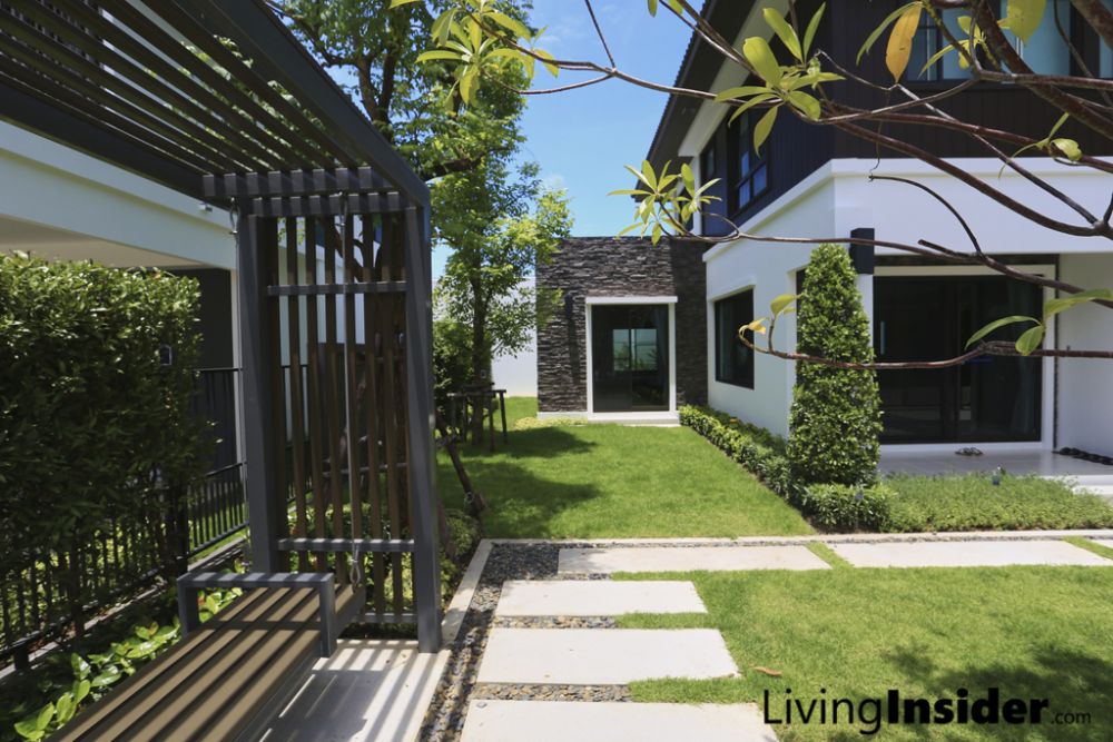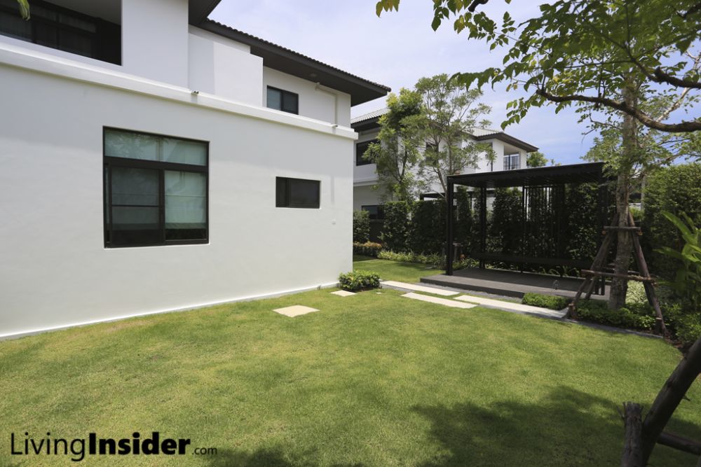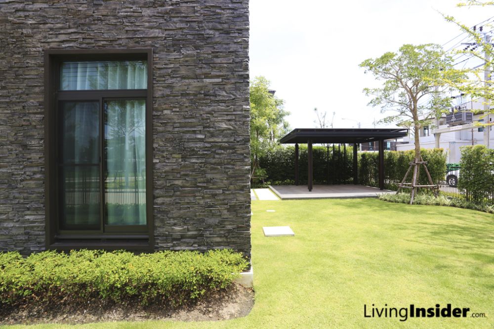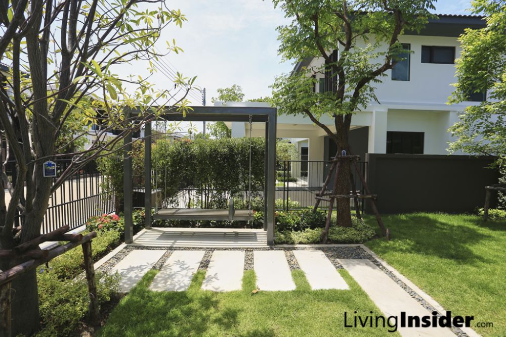 บ้านทุกหลังมีการออกแบบสวนโดยภูมิสถาปนิก ที่ดูลงตัวโดยรอบตัวบ้าน มีมุมชิงช้าสไตล์โมเดิร์นที่ดูเรียบง่าย แต่ใช้งานได้ดีมุมนี้มองตรงไปคือห้องเอนกประสงค์