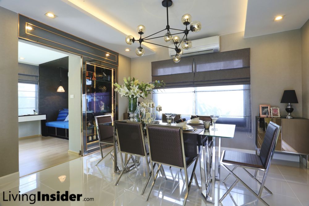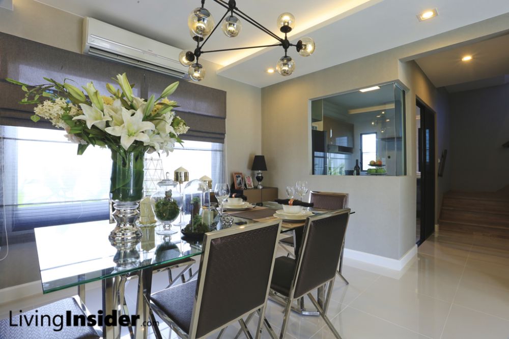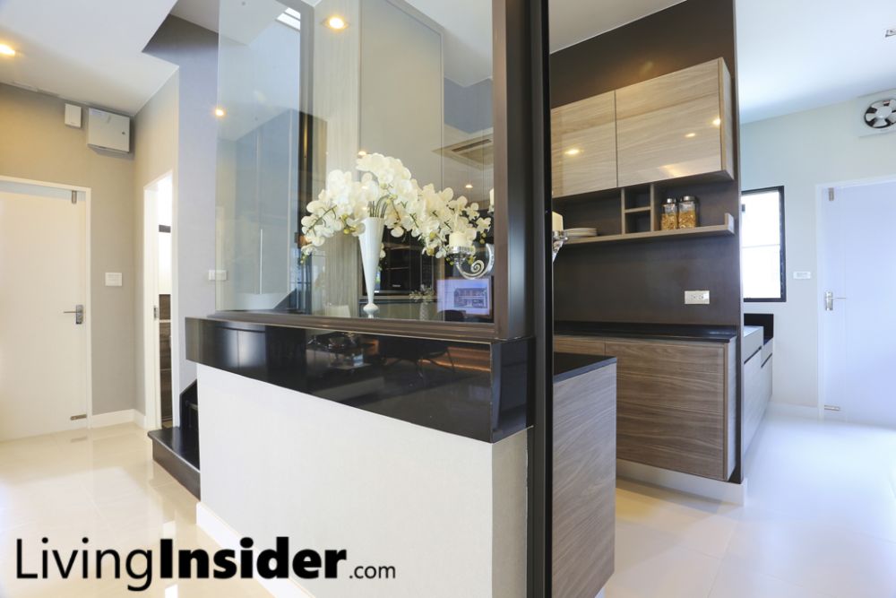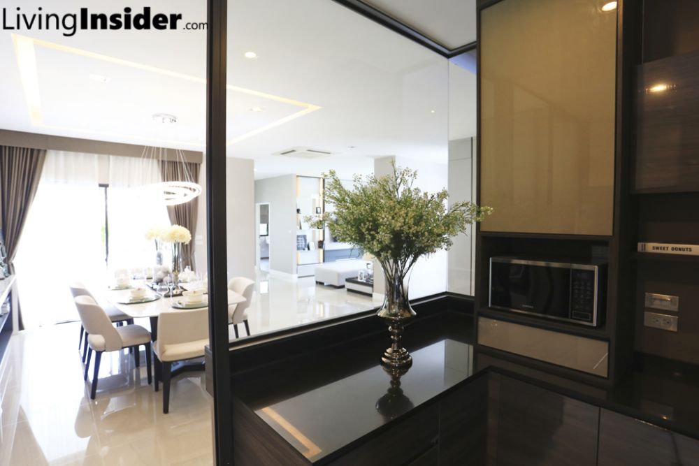 มุมนี้ต่อเนื่องไปยังห้องครัว ที่กั้นผนังส่วนหนึ่งด้วยกระจก ช่วยให้ห้องครัวดูไม่ทึบ และยังได้เห็นกิจกรรมการทำครัวของคุณแม่บ้าน