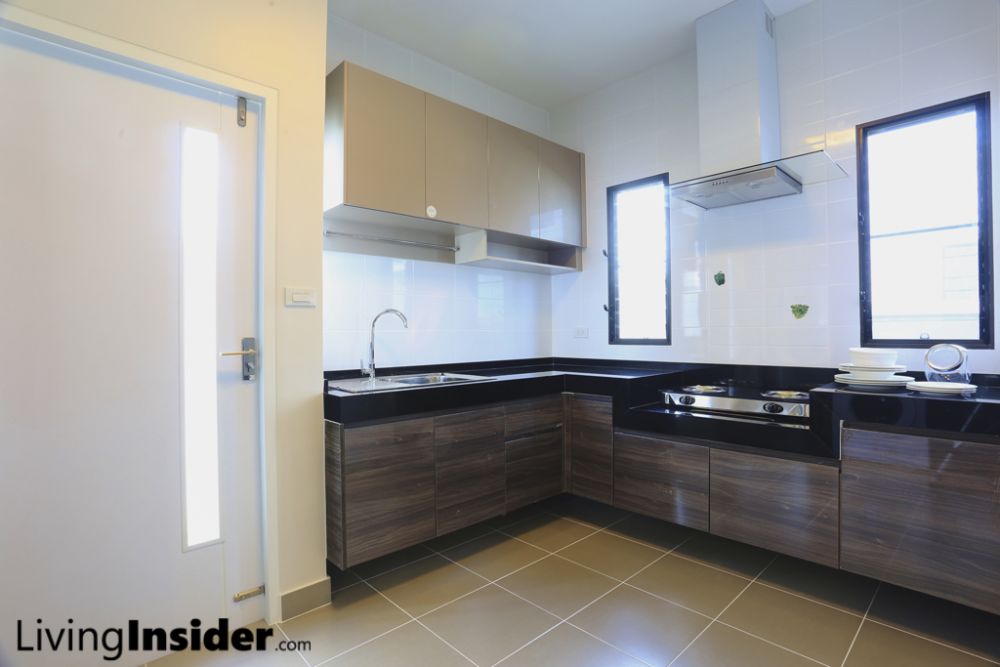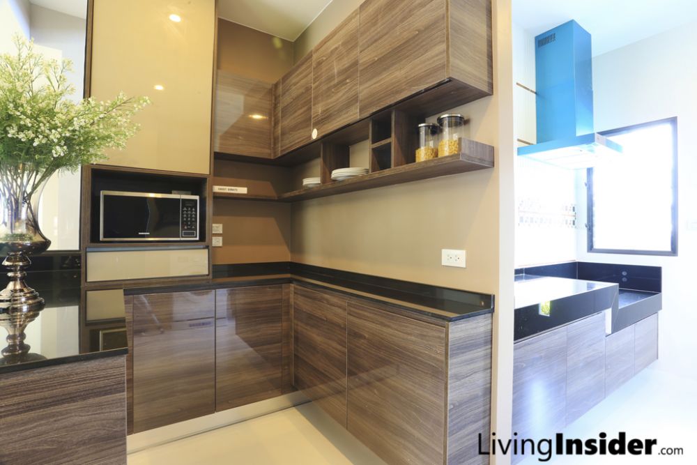 ห้องครัว แยกเป็นสัดส่วนระหว่างส่วนเตรียมอาหารและส่วนปรุงอาหาร เคาน์เตอร์ส่วนครัวไทย Top หินแกรนิต และ Sink ล้างจาน เตรียมไว้อย่างเสร็จสรรพ