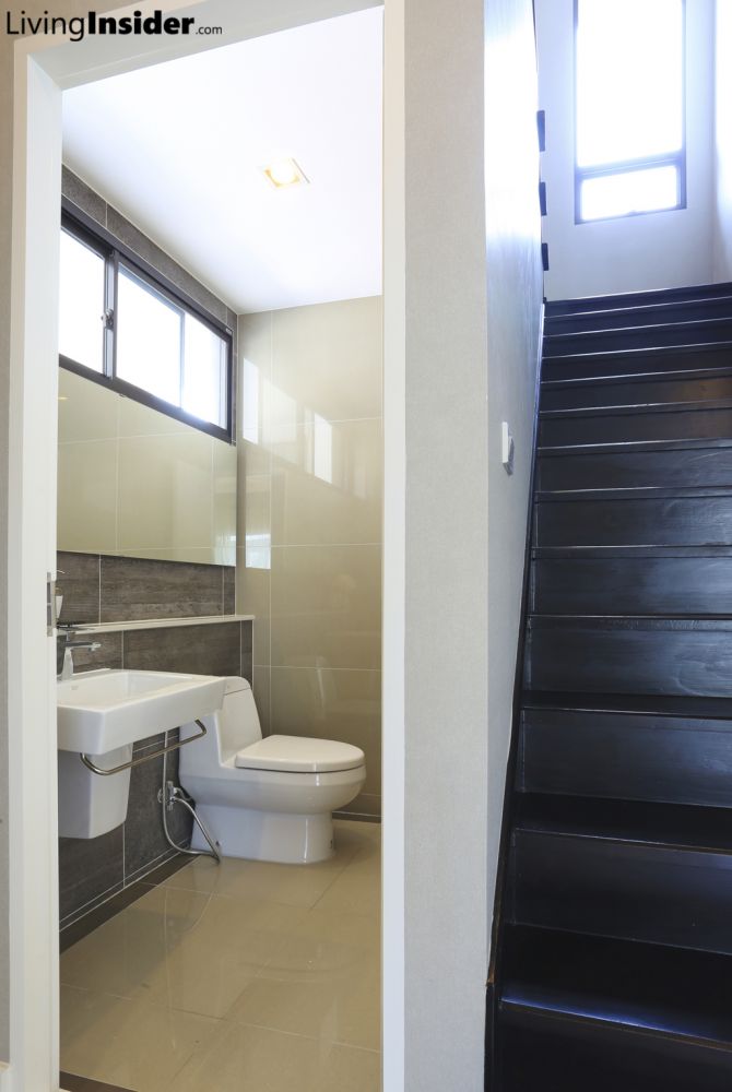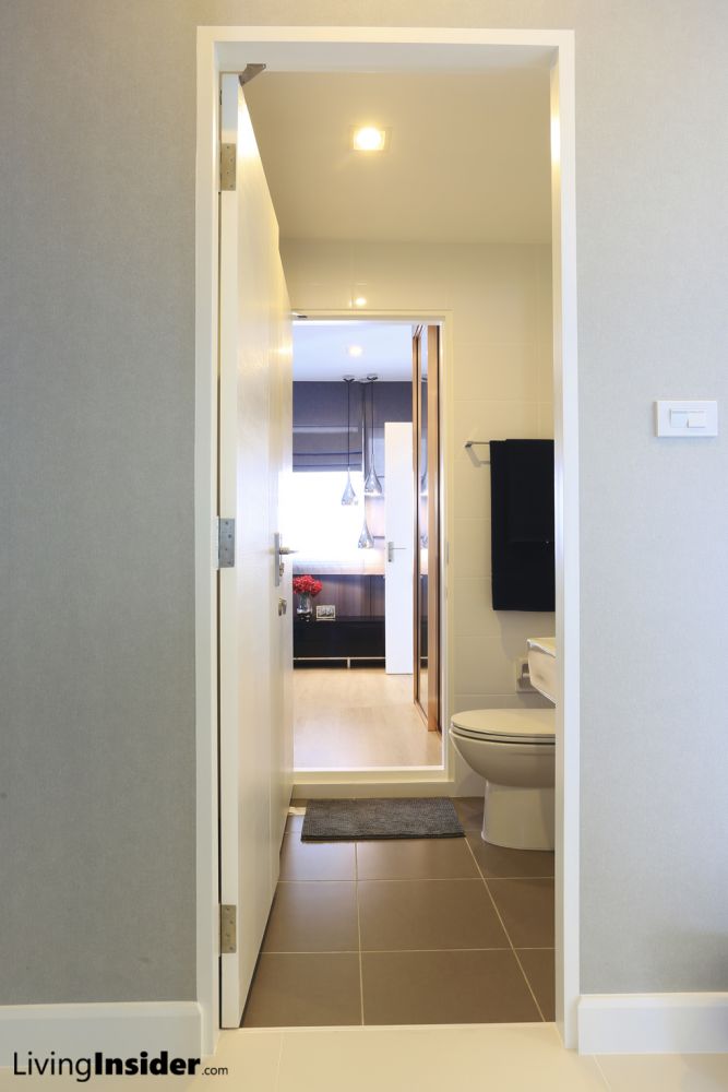 ออกจากห้องครัวมาจะเจอกับประตูทางเข้าห้องน้ำชั้นล่าง ซึ่งใช้ร่วมกับห้องนอนเล็กชั้นล่าง ห้องน้ำมีประตูเปิด 2 ด้าน