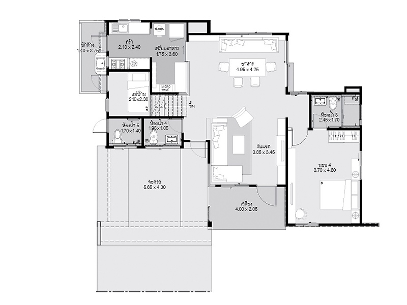 พื้นที่ห้องเอนกประสงค์ด้านข้างตัวบ้าน มีประตูกระจกบานใหญ่เปิดออกสู่พื้นที่สวน สามารถปรับเปลี่ยนฟังก์ชันได้ตามต้องการ