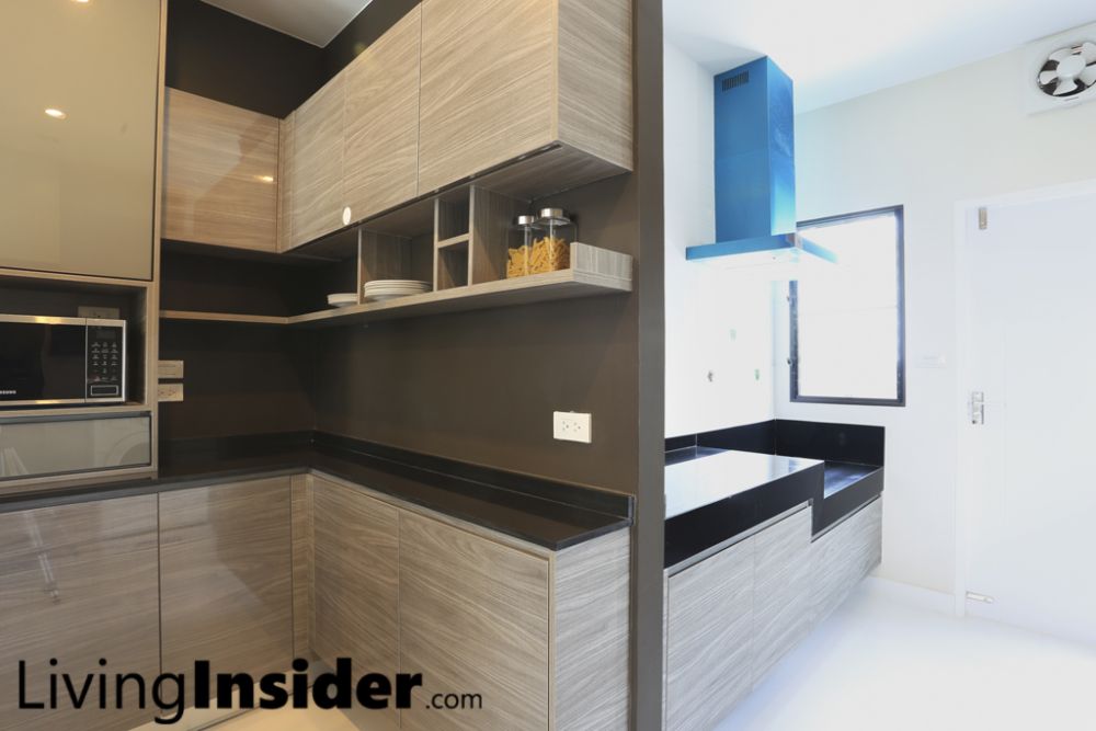 พื้นที่ภายในห้องครัวที่มีพร้อมเฟอร์นิเจอร์ครัว ส่วนจัดเตรีมอาหารพร้อมเคาน์เตอร์ ติดตั้งเครื่องดูดควันภายในห้องครัวพร้อมพัดลมดูดอากาศ