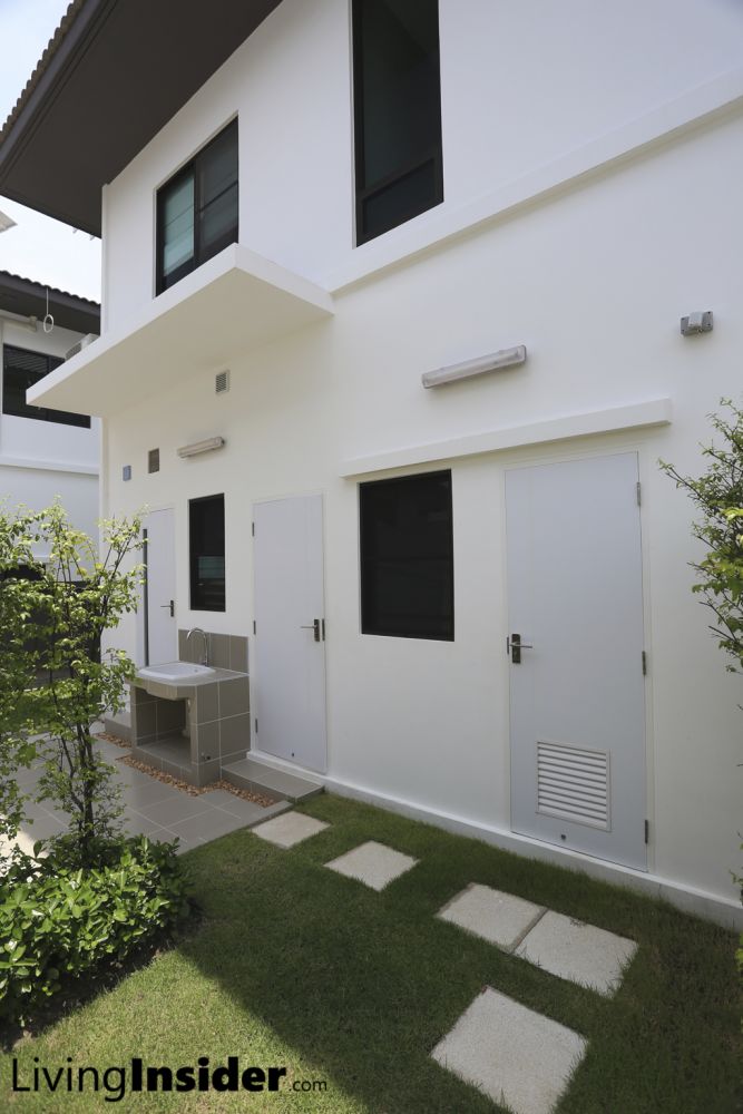จากห้องครัวมีประตูเปิดออกสู่ด้านข้าง ประตูห้องที่ติดกับอ่างล้างมือนั่นคือประตูห้องแม่บ้าน และถัดมาคือประตูห้องน้ำของแม่บ้าน