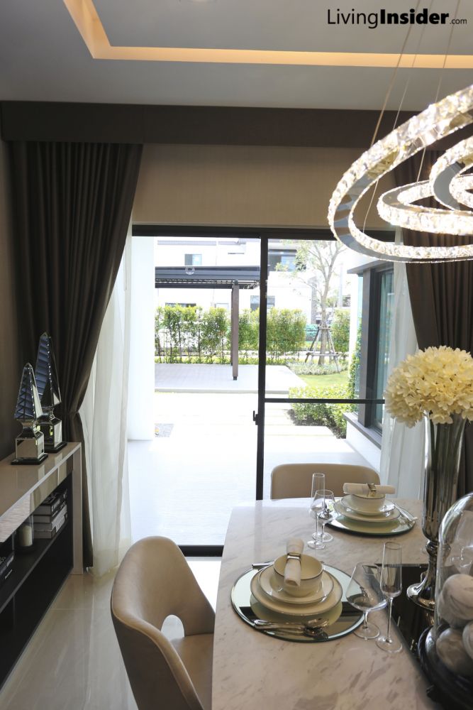 มุมโต๊ะรับประทานอาหารมีประตูบานกระจกเปิดออกสู่พื้นที่ส่วนด้านข้างหลังบ้าน