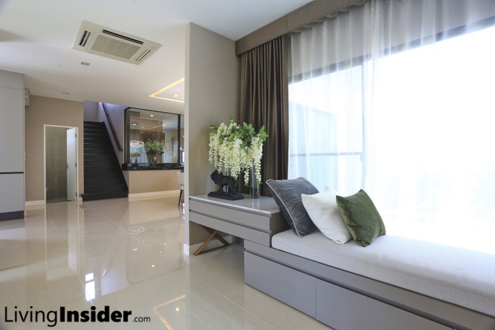 นี่คือภาพแรกที่เปิดประตูบ้านเข้ามาในบ้านแบบ Increaso ดูโปร่งสบายและเรียบหรูเพราะคุมโทนของบ้านด้วยสีของกระเบื้องแกรนิโต้อย่างดีและสีของผนังติดวอลล์เปเปอร์ทั้งหลัง เรียกว่าแต่งให้เกือบครึ่งทาง เหลือให้เจ้าของบ้านมาใส่ดีเทลงานตกแต่งได้ตามรสนิยม