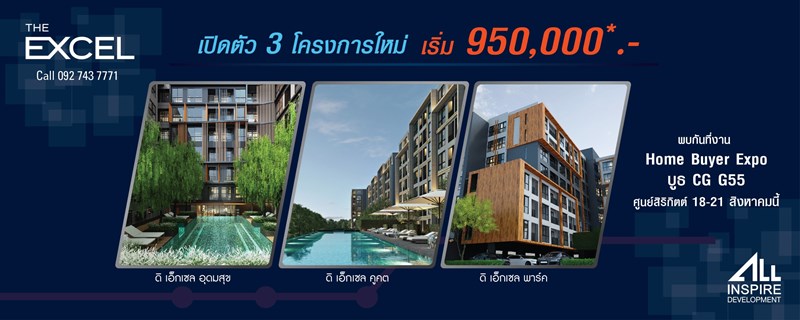 เป็นที่น่าจับตามองมากๆ สำหรับ บริษัท ออลล์ อินสไปร์ ดีเวลลอปเม้นท์ จำกัด (มหาชน) ดีเวลลอปเปอร์น้องใหม่รายนี้ มีการเคลื่อนไหวที่รวดเร็วจนน่าตกใจ ด้วยระยะเวลาเพียง 2 ปีกว่าๆ ประสบความสำเร็จในการพัฒนาโครงการแล้วถึง 4 โครงการ ( Excel Bearing, Excel Hideaway, Excel Hybrid, Excel Groove ) รวมมูลค่าโครงการกว่า 1,754 ล้านบาท เป็นตัวเลขที่น่าเหลือเชื่อมาก สำหรับบริษัทที่พึ่งพัฒนาโครงการมาเพียงไม่นาน และในวันที่ 18-21 สิงหาคมนี้ บริษัทยังได้เตรียมเปิด Pre Sale ครั้งแรกกับ 3 โครงการใหม่ ในงาน Home Buyer Expo ที่ศูนย์สิริกิตต์ โดยเริ่มแค่ 950,000 บาทเท่านั้น