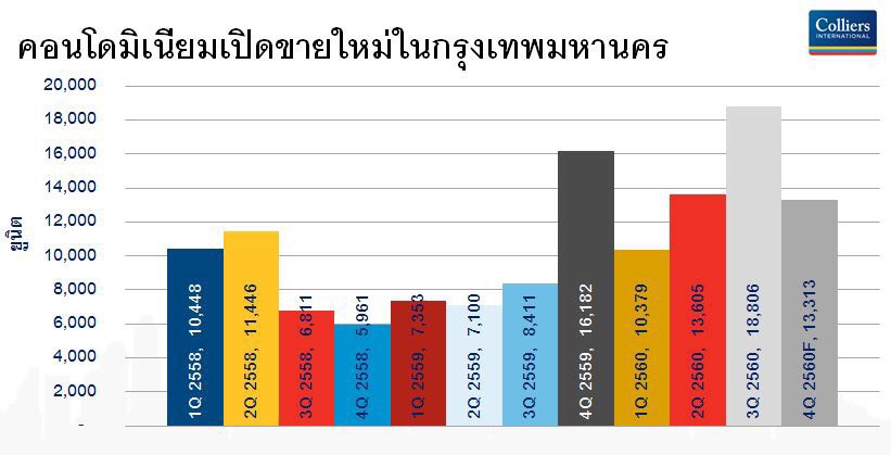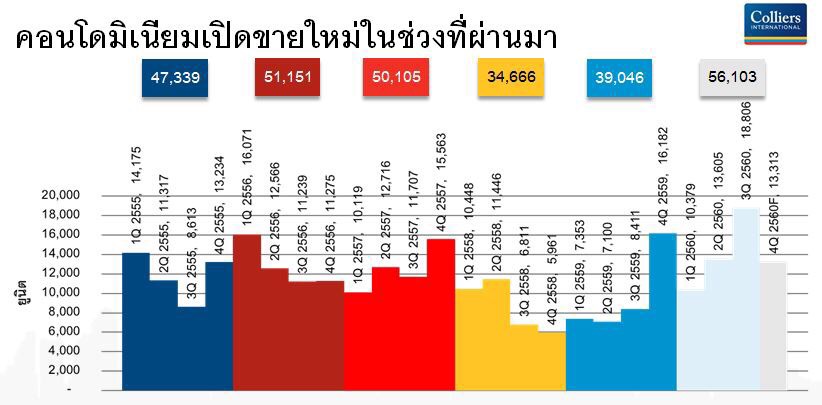 นายสุรเชษฐ กองชีพ ผู้อำนวยการฝ่ายวิจัย บริษัท คอลลิเออร์ส อินเตอร์เนชั่นแนล (ประเทศไทย) จำกัด เปิดเผยว่า ช่วง 11 เดือนแรก (มกราคม-พฤศจิกายน 2560) มีคอนโดมิเนียมเปิดตัวใหม่ 56,103 ยูนิต โดยไตรมาส 4/60 มีคอนโดฯ เปิดตัวใหม่ ณ พฤศจิกายน จำนวน 13,310 ยูนิต คิดเป็นอัตราเติบโต 44% เทียบกับช่วงเดียวกันของปี 2559 และเป็นสถิติการเปิดตัวสูงที่สุดในรอบ 5-6 ปีที่ผ่านมา