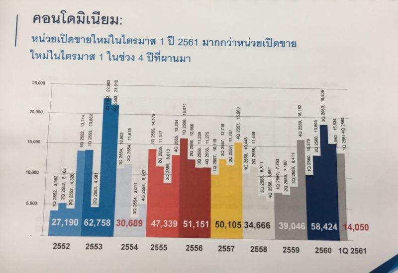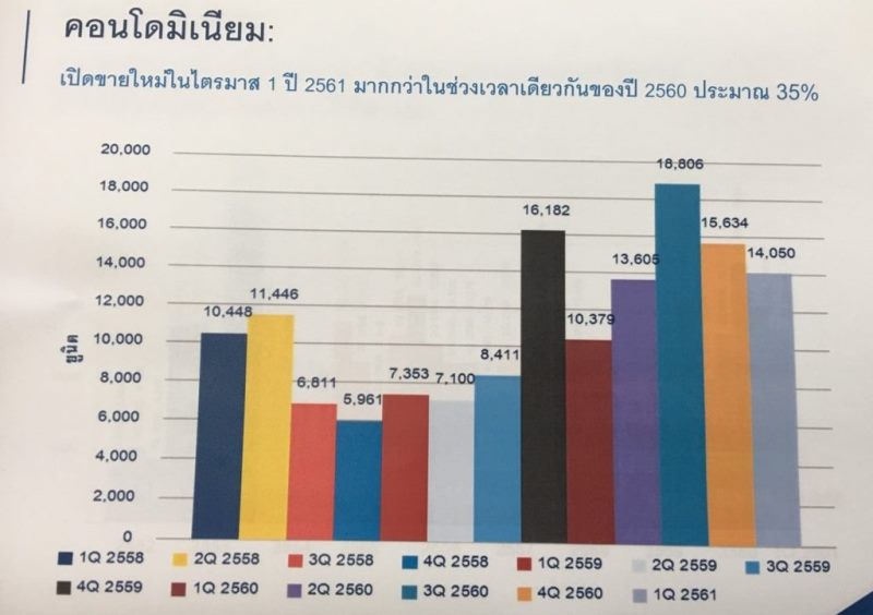 และการเปิดตัวไตรมาส 1/61 ยังพบว่าทำสถิติเปิดตัวสูงสุดในรอบ 4 ปี เทียบกับการเปิดตัวในช่วงไตรมาส 1 ของปี 2557, 2558, 2559 ที่มีการเปิดตัว 10,119 ยูนิต, 10,448 ยูนิต และ 7,353 ยูนิต ตามลำดับ