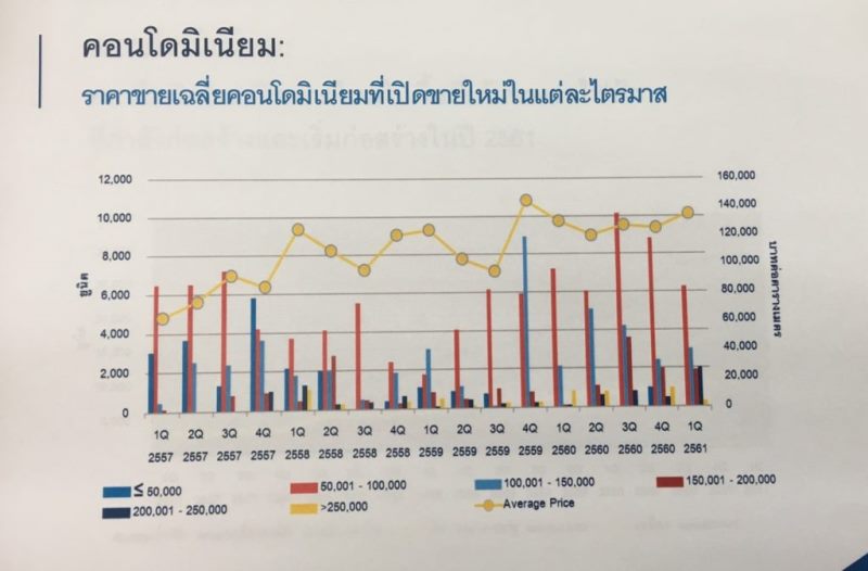 ในด้านราคาขายเฉลี่ยของคอนโดฯ ที่เปิดขายใหม่ปีนี้ ในช่วงไตรมาส 1/61 เฉลี่ยเกิน 1.31 แสนบาท/ตารางเมตร โดยราคาต่ำสุด 3 หมื่นบาท/ตารางเมตร ไปจนถึงสูงสุดที่ 7 แสนบาท/ตารางเมตร ในขณะที่ค่าเฉลี่ยนิวไฮอยู่ในช่วงไตรมาส 4/59 ที่มีค่าเฉลี่ยเกิน 1.4 แสนบาท/ตารางเมตร และนับเป็นสถิตินิวไฮในรอบ 4 ปี (ไตรมาส 1/57 ถึงไตรมาส 1/61)