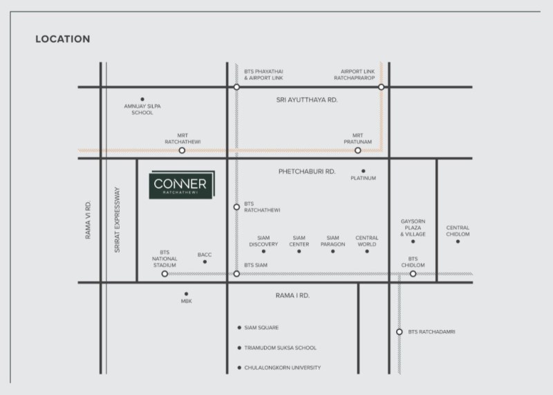 ไฮไลท์ของโครงการก็คงจะหนีไม่พ้นชื่อโครงการ CONNER ที่มาจากคำว่า Corner Location หมายถึงทำเลที่ตั้งอยู่บนหัวมุมแยกราชเทวี จุดตัดของถนนสำคัญอย่างเพชรบุรีและพญาไท และยังเป็นจุดตัดของรถไฟฟ้า BTS สายสีเขียวกับ MRT สายสีส้ม และ "Corner Room"
