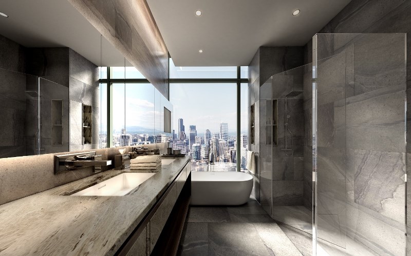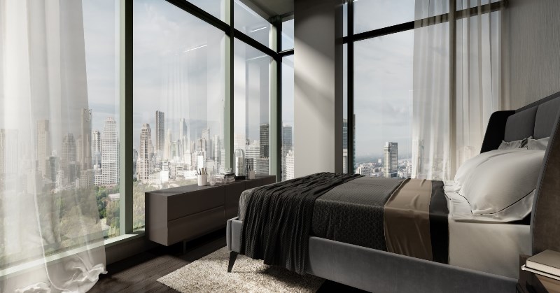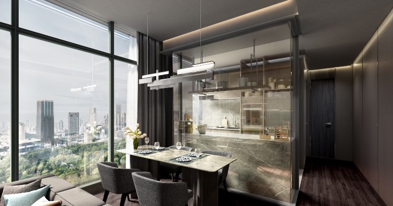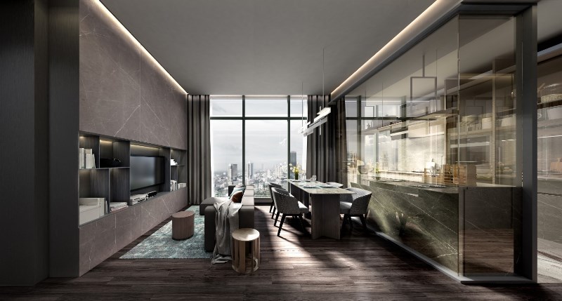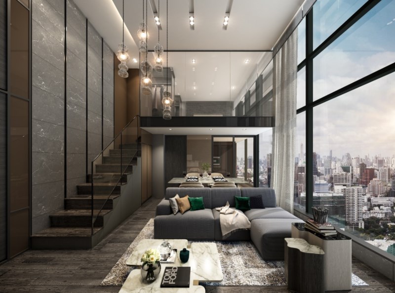 จากภาพตัวอย่างด้านบนจะเห็นได้ถึงห้อง Simplex ที่มีโครงการสร้างเหมือนคอนโดทั่วไป แต่ทว่าโดดเด่นด้วยการใช้วัสดุตั้งแต่การปูพื้น ปูผนัง และการจัดวางฟังก์ชั่นใช้สอยได้เป็นสัดส่วน ที่สำคัญคือมองเห็นวิวกรุงเทพได้อย่างจุใจด้วยกระจกทรงสูงจรดเพดาน ด้วย Floor-to-ceiling สูง 3 เมตร หน้ากว้าง 15 เมตร เปิดรับวิวกรุงเทพได้อย่างสุดสายตา