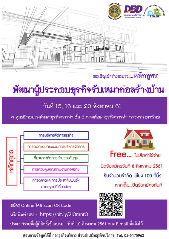 สำหรับ ผู้สนใจเข้าร่วมโครงการฝึกอบรมครั้งนี้ สามารถสมัครได้ทางออนไลน์ โดยแสกน QR Code หรือสอบถามรายละเอียดได้ที่ กองธุรกิจบริการ กรมพัฒนาธุรกิจการค้า กระทรวงพาณิชย์ ตั้งแต่บัดนี้เป็นต้น โดยไม่มีค่าใช้จ่ายใดๆ ทั้งสิ้น (ปิดรับสมัคร 8 สิงหาคม 2561 และประกาศรายชื่อผู้มีสิทธิ์เข้าอบรม วันที่ 10 สิงหาคม 2561)