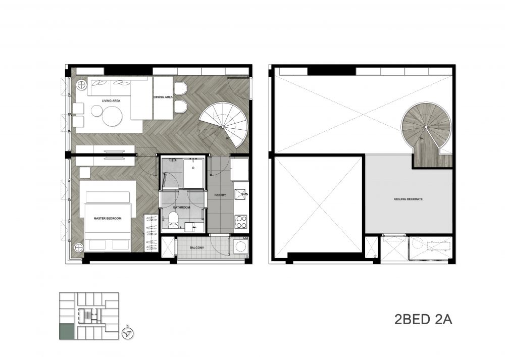 สำหรับห้องแบบ 2 ห้องนอนนี้ เปิดเข้ามาจะเจอกับห้องนั่งเล่นหน้ากว้าง และดูโปร่งโล่ง ไม่อึดอัดเลย สามารถอยู่เป็นครอบครัวได้อย่างสบายๆ มีพื้นที่กว้างพอสำหรับวางโซฟาขนาดใหญ่รวมถึงโต๊ะอาหารสำหรับ 4 คนและยังเหลือพื้นที่เดินอีกเพียบ บันไดเชื่อมต่อถึงห้องนอนเล็ก ในส่วนนี้มีกระจกเต็มบานให้ห้องดูโปร่งกว้างสามารถรับวิวใจกลางเมืองได้เต็มๆ