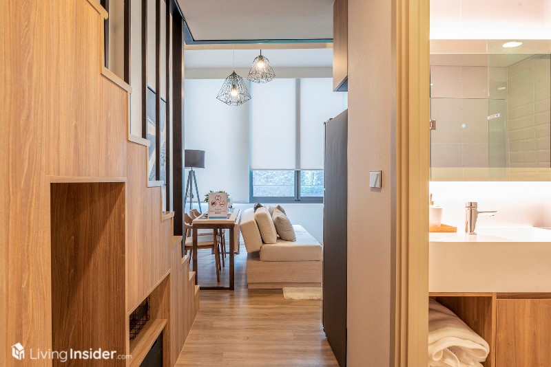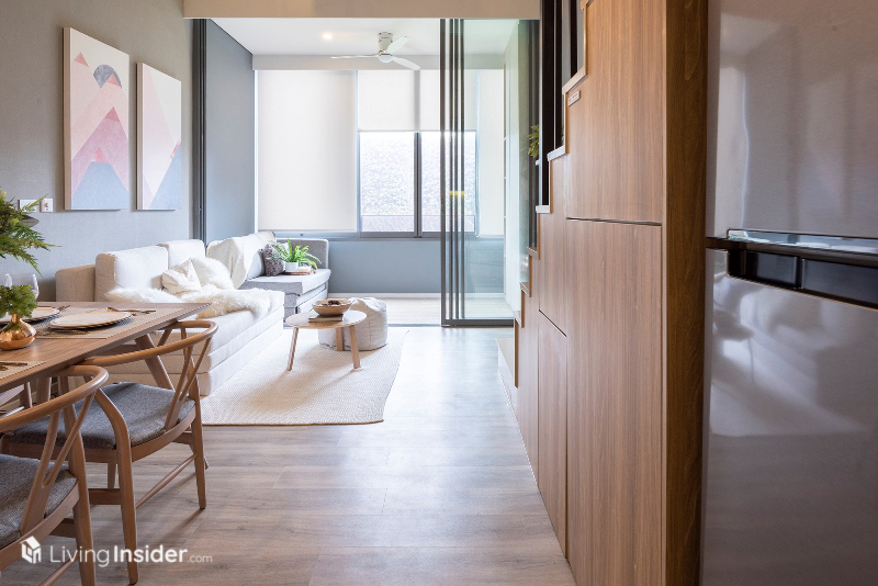 เดินเข้ามาอีกหน่อยทางขวามือจะเป็นส่วนครัวแพนทรีขนาดพอเหมาะ บิวท์อินปิดผิวด้วยลายไม้ เหมาะกับการทำอาหารมื้อเล็กๆ เนรมิตเมนูโปรดของคุณได้ง่ายๆ ในมุมขนาดพอเหมาะ อีกทั้งยังมีพื้นที่พอสำหรับวางตู้เย็น 2 ประตูได้พอดี