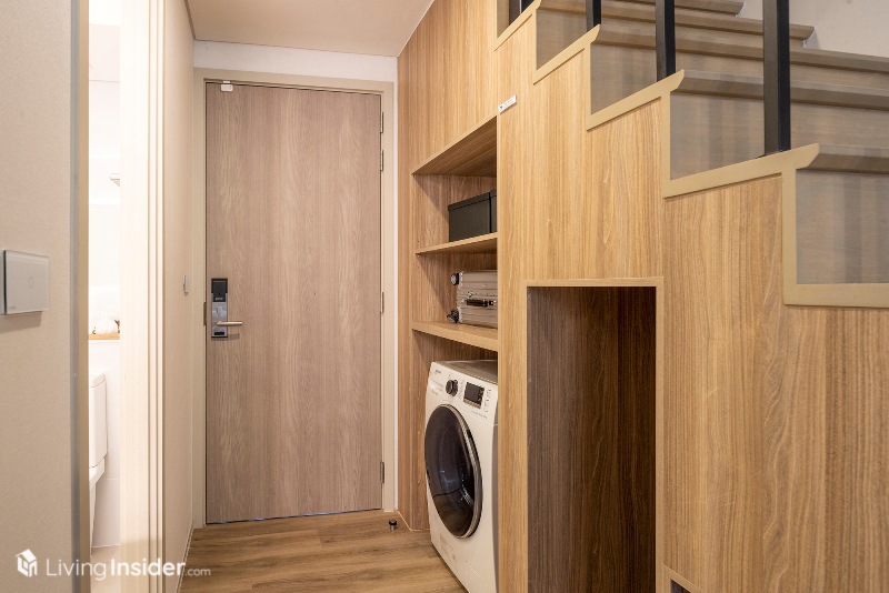 เปิดเข้ามาซ้ายมือจะพบกับส่วนเก็บของใต้บันได ซึ่งมีพื้นที่ว่างพอสามารถวางตู้ซักผ้า ภายในห้องเพดานสูง ช่วยให้ห้องดูกว้างขึ้น การตกแต่งแบบสแกนดิเนเวียน ดูอบอุ่นด้วยสีและวัสดุจากไม้