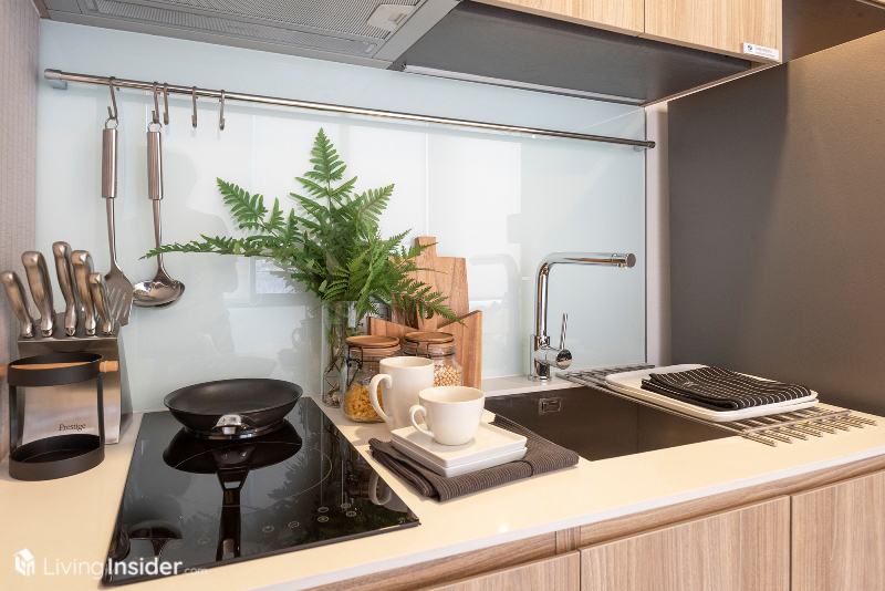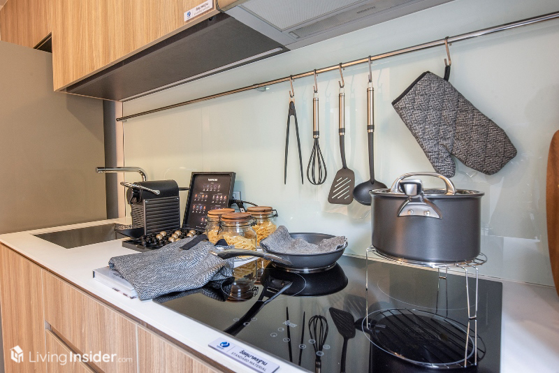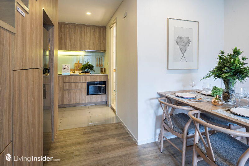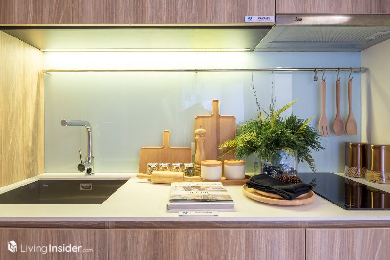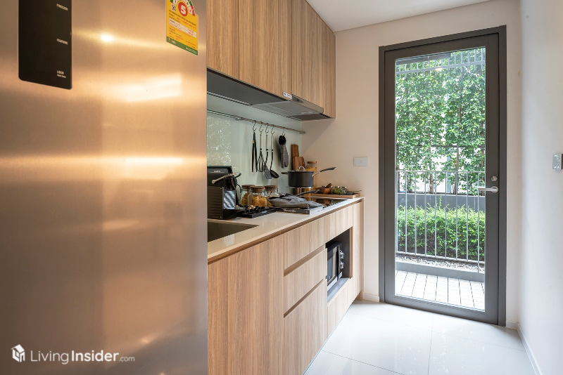 ส่วนครัวถูกออกแบบให้อยู่ด้านหลังจะเชื่อมต่อกับระเบียง แพนทรีตกแต่งด้วยบิวท์อินลายไม้พร้อมกับชั้นเก็บของติดผนังของเยอะแค่ไหนก็ไม่ต้องกังวล อีกทั้งมีพื้นที่ให้วางตู้เย็นขนาด 2 ประตูและช่องสำหรับวางไมโครเวฟได้อีกด้วย