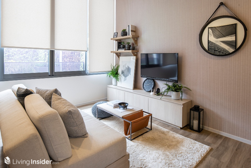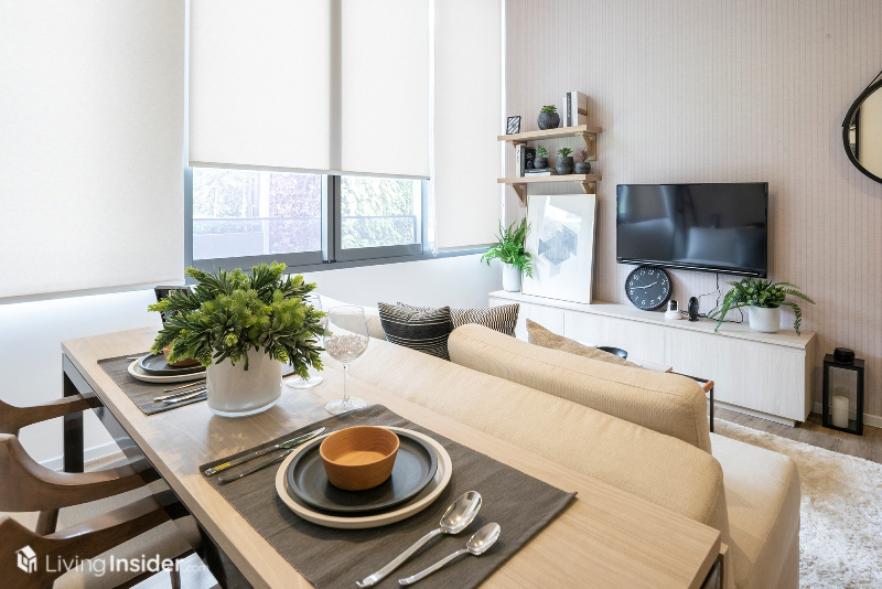ส่วนของพื้นที่นั่งเล่นนอกจากวางโซฟาแล้ว สามารถวางโต๊ะกินข้าวได้ และยังเหลือพื้นที่เดินได้สบายๆ ตกแต่งด้วยหน้าต่างที่จะช่วยสร้างความสดชื่นในมุมโปรดของคุณ ด้วยแสงที่ส่องผ่านหน้าต่างทำให้พื้นที่ห้องดูโปร่งกว้างขึ้นไปอีก ถือว่าเป็นการจัดวางองค์ประกอบห้องที่ลงตัวเลยทีเดียว