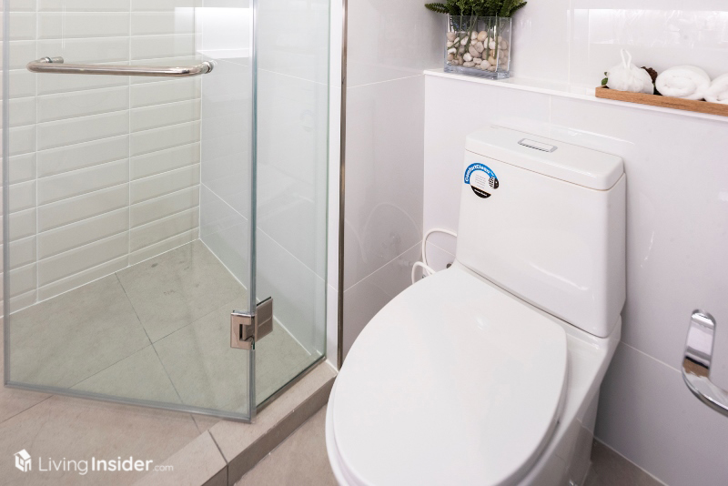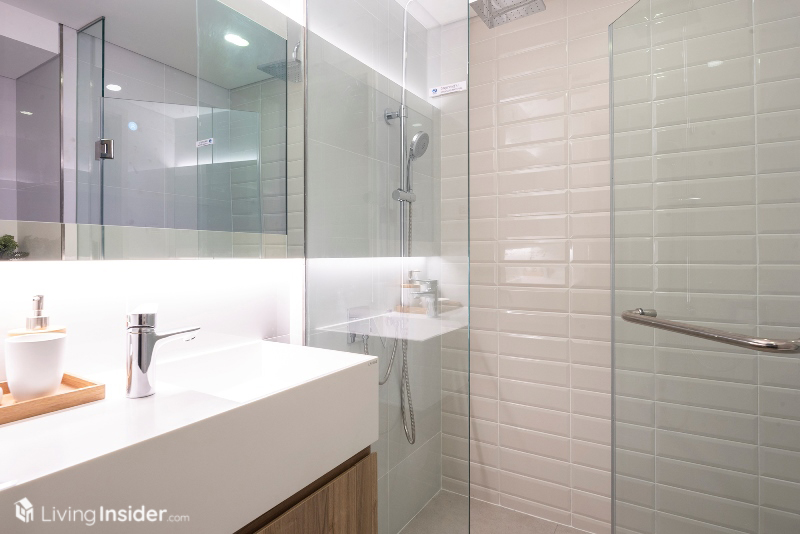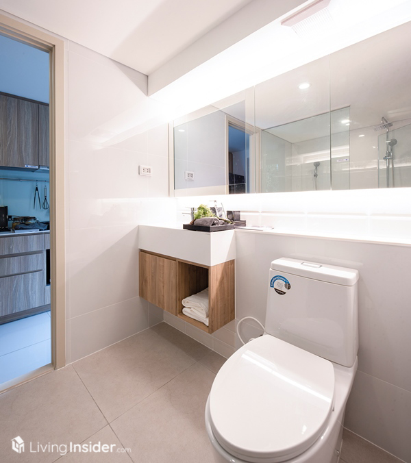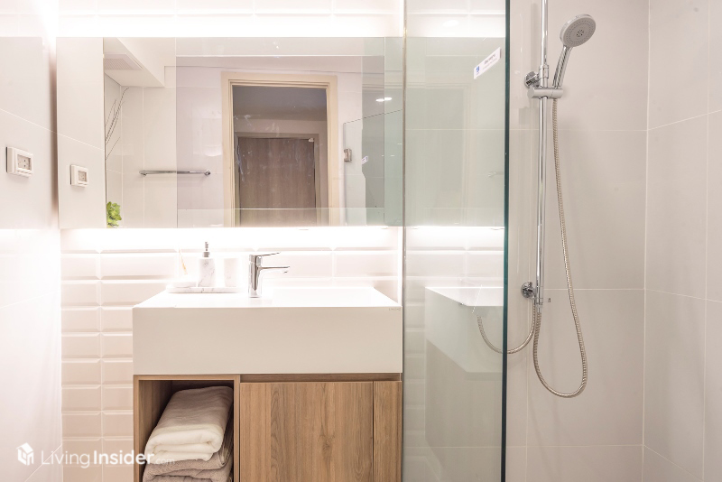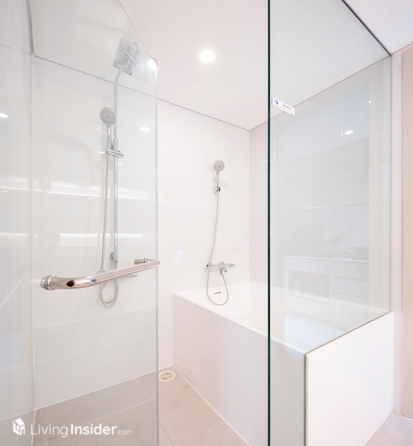 ส่วนห้องน้ำมี 2 ประตูสามารถเข้าได้จากห้องครัว และห้องนอนใหญ่ กั้นโซนอาบน้ำด้วยประตูกระจก สำหรับห้องน้ำมีทั้งระบบอาบน้ำแบบฝักบัว และอ่างอาบน้ำขนาดกำลังพอดีสามารถนั่งแช่น้ำผ่อนคลายได้สบายๆ อีกทั้งยังประดับตกแต่งดัวกระจกบานใหญ่ที่จะช่วยให้ห้องน้ำดูกว้างขึ้นอีก