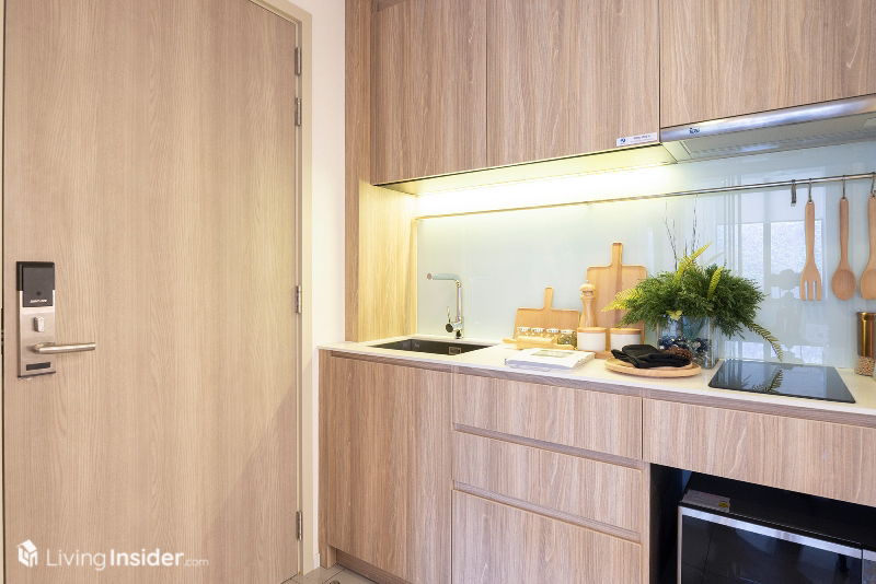 ห้องนี้เมื่อเปิดเข้าประตูมาซ้ายมือเป็นส่วนครัวแพนทรี บิวท์อินลายไม้ พร้อมชั้นเก็บของติดผนัง มีช่องสำหรับวางไมโครเวฟขนาดกำลังดี มีพื้นที่พอให้คุณได้สร้างสรรค์เมนูแสนอร่อยได้ง่ายๆ