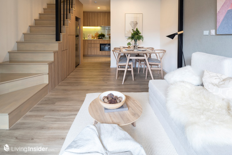 เดินต่อมาขวามือจะเป็นบันไดที่มีห้องเก็บของในตัว และเมื่อเข้ามาสู่ตัวห้องนั่งเล่นที่มีพื้นที่สำหรับวางโต๊ะอาหาร 4 คน และวางโซฟาได้สบาย ยังเหลือพื้นที่ให้ใช้สอยอีกเพียบ