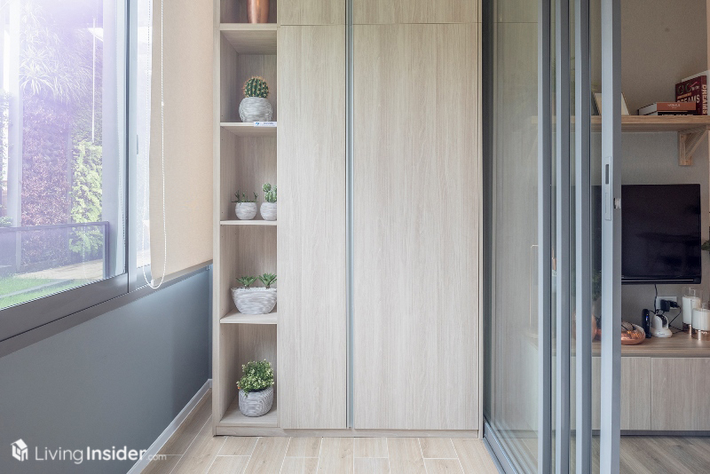 ถัดมาจะเป็นส่วนห้องอเนกประสงค์แยกโซนด้วยประตูกระจกบานเลื่อน สามารถใช้เป็นห้องทำงาน หรือห้องนอนเล็ก ได้อีกด้วย มาพร้อมกับบิวอินท์ตู้เสื้อผ้าลายไม้