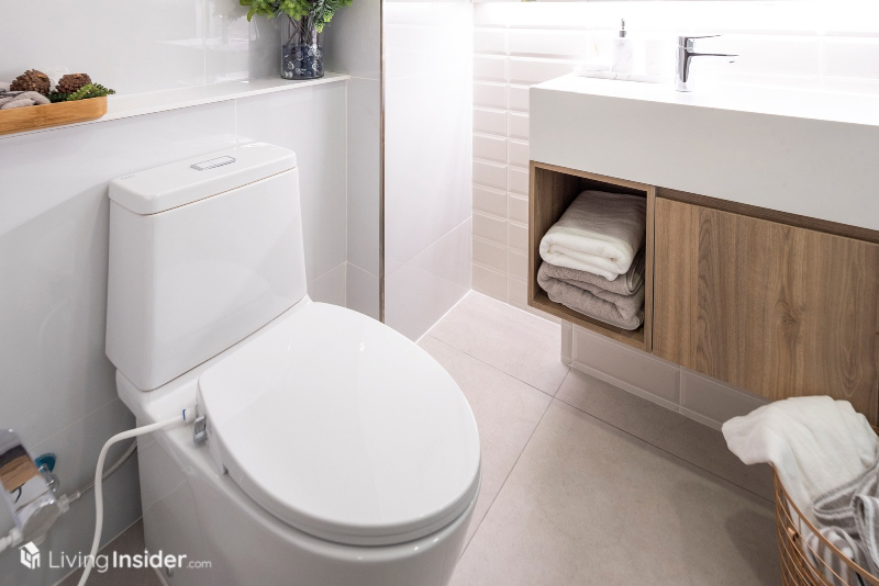 เดินตรงมาจะพบกับส่วนห้องน้ำ ที่มีพร้อมทั้งสุขภัณฑ์ อ่างล้างหน้าขนาดพอเหมาะที่มีตู้เก็บของในตัว แยกโซนอาบน้ำด้วยกระจกใส จัดสรรพื้นที่ได้เป็นอย่างดี