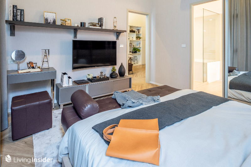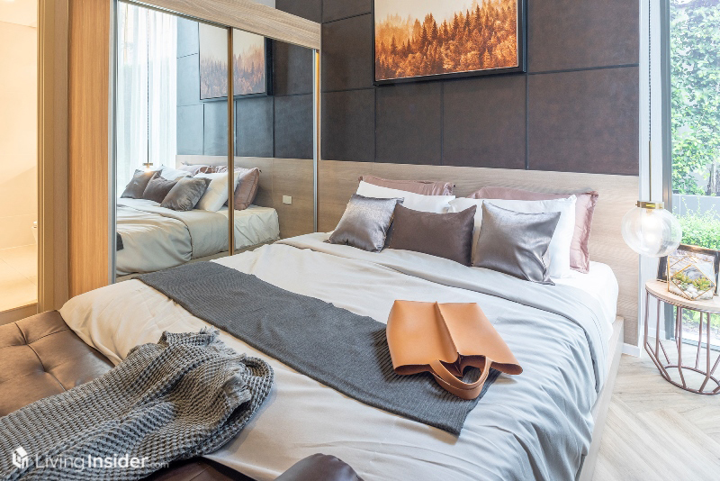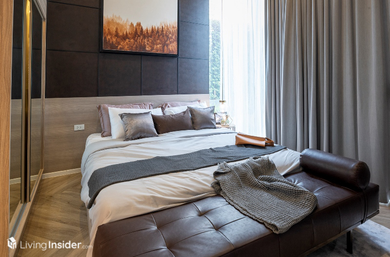 ส่วนห้องนอนสามารถวางเตียงขนาด King Size ได้สบาย ยังเหลือพื้นที่ใช้สอยอีกค่อนข้างเยอะเลยทีเดียว อีกทั้งยังมาพร้อมกับโต๊ะเครื่องแป้งขนาดพอดีกับห้อง และตู้เสื้อผ้าขนาดใหญ่ให้เก็บเสื้อผ้าชุดโปรดได้อย่างจุใจ ด้วยการที่ส่วนนี้เป็นส่วนของมุมห้องขนาดกว้างจึงทำให้สามารถนอนชมวิวบรรยากาศภายนอกได้อย่างเต็มที่