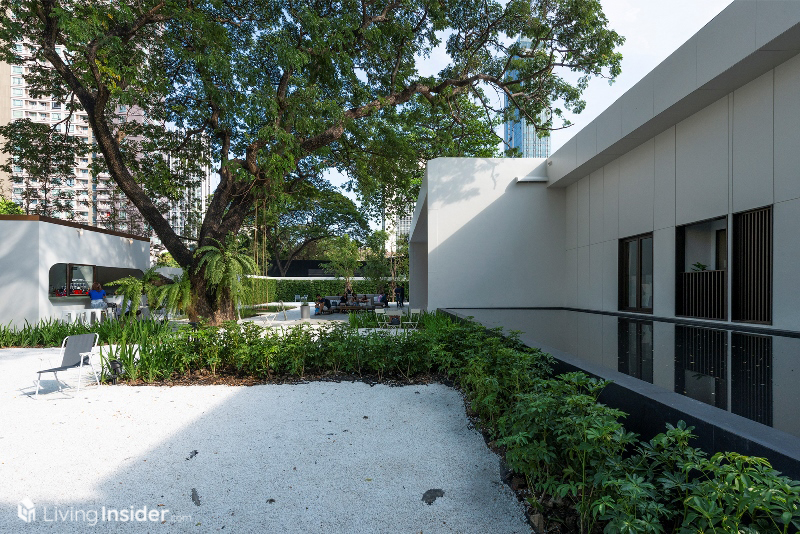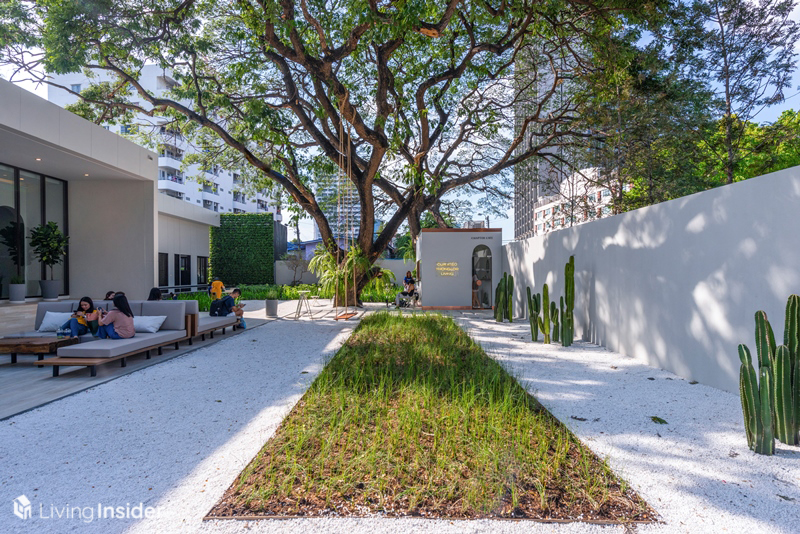ในส่วนสำนักงานขายออกแบบมาดูเรียบง่ายสบายตา สอดแทรกด้วยรายละเอียดการตกแต่ง และความเป็นธรรมชาติของพรรณไม้ต่างๆ พร้อมกับมี Cafe เปิดให้บริการและมุมถ่ายภาพชิคๆ อยู่เพียบ เรียกได้ว่าเอาใจคนยุคสมัยนี้จริงๆ