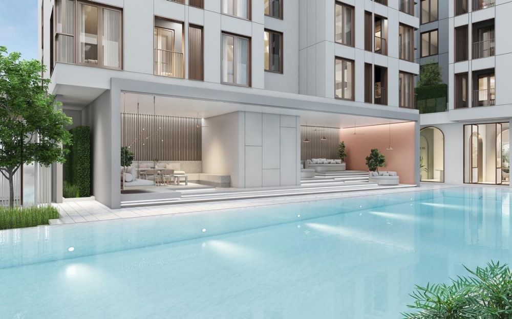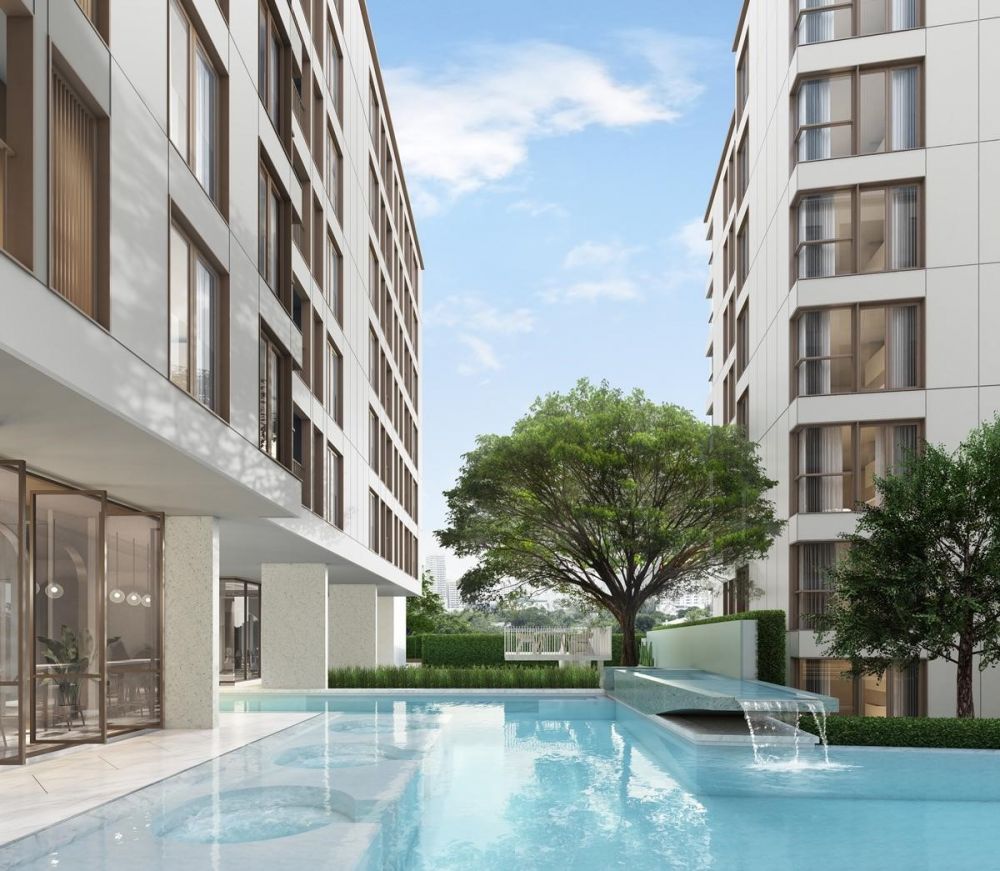 สระว่ายน้ำ White-Marble Pool ปูพื้นสระด้วยหินตลอดทุกพื้นที่ ส่วนนี้มี Co-Creating Deck จัดที่นั่ง Semi-Outdoor พักผ่อนชมวิวสระ ตากอากาศเหมือนรีสอร์ท และ Co-Kitchen Space ไว้มาทำอาหาร นั่งพบปะสังสรรค์กันเบาๆ
