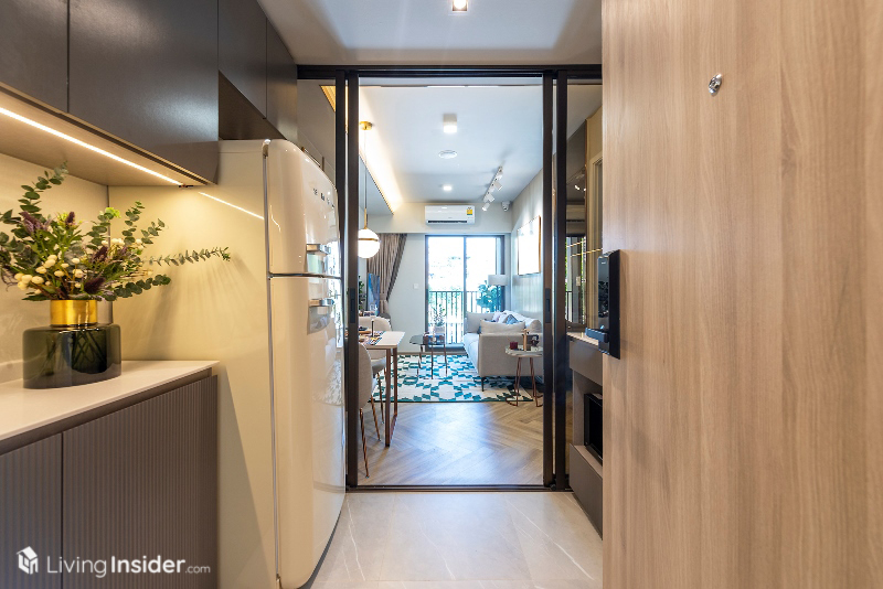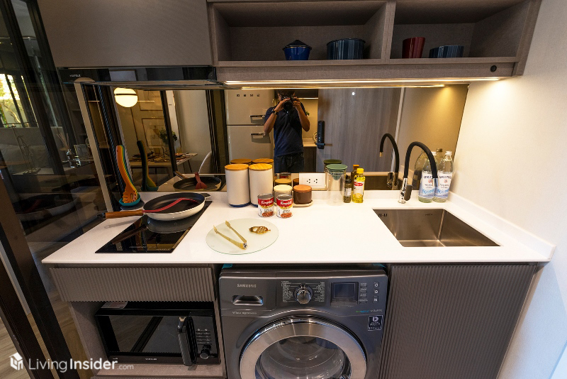 เปิดมาเจอพื้นที่ครัวปิด บิวท์อินแพนทรีตามห้องตัวอย่าง ท็อปเป็นหินสังเคราะห์ หน้าบานตู้เก็บของลามิเนตผิวด้าน เตาไฟฟ้า เครื่องดูดควัน ก๊อกยางของแบรนด์ Hafele ผนังกรุกระจกสีชา พร้อมช่องวางเครื่องซักผ้า / ไมโครเวฟ ตรงข้ามคือ ตู้เก็บรองเท้า - อเนกประสงค์