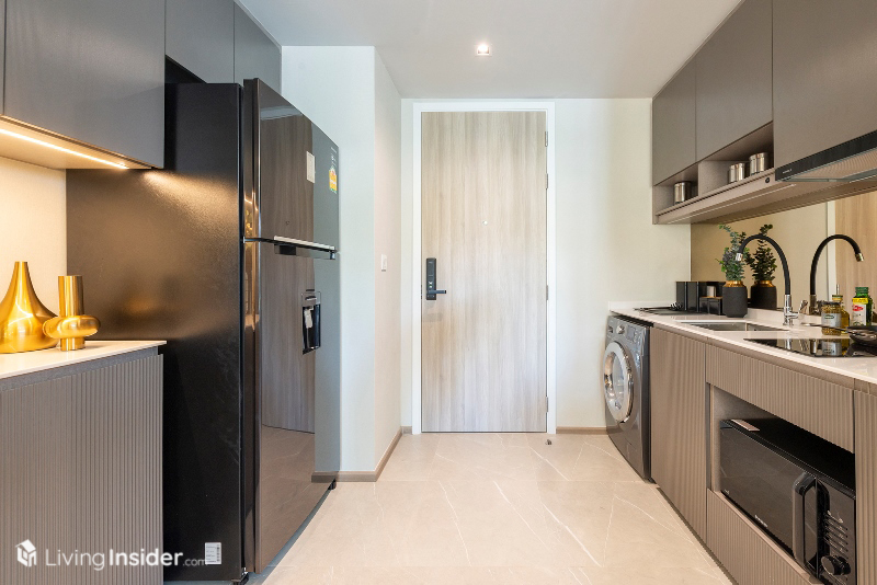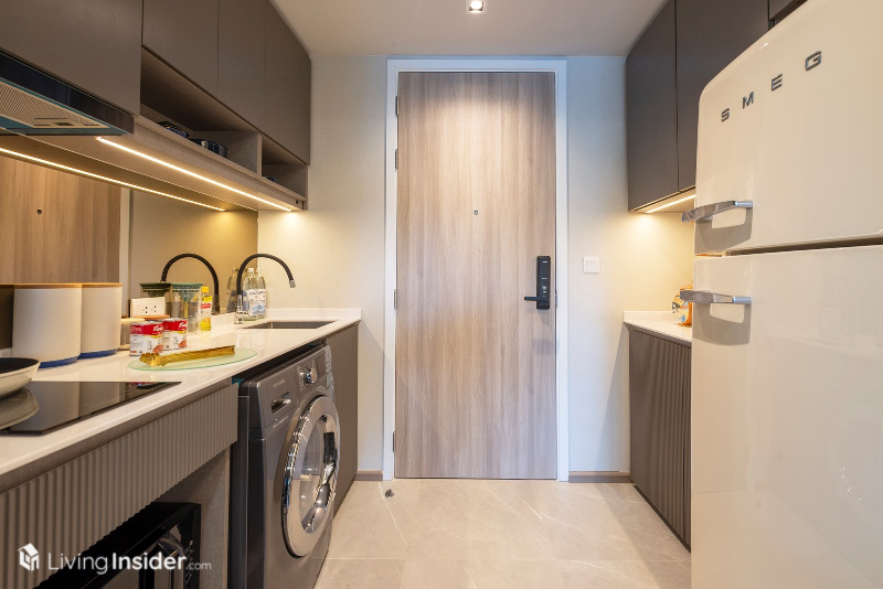 เปิดเข้ามาพบกับพื้นที่ครัวเหมือน 1-Bedroom แต่ดูกว้างกว่า สามารถวางตู้เย็น 2 ประตูขนาดใหญ่ และพื้นที่เตรียมอาหารมากขึ้น เตาไฟฟ้า เครื่องดูดควันต่างๆ มาครบเหมือนเดิม