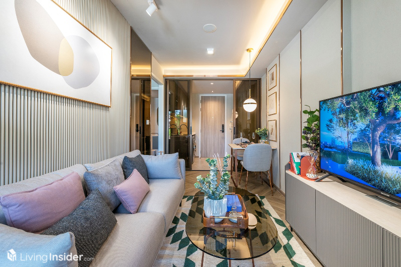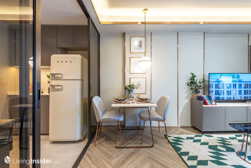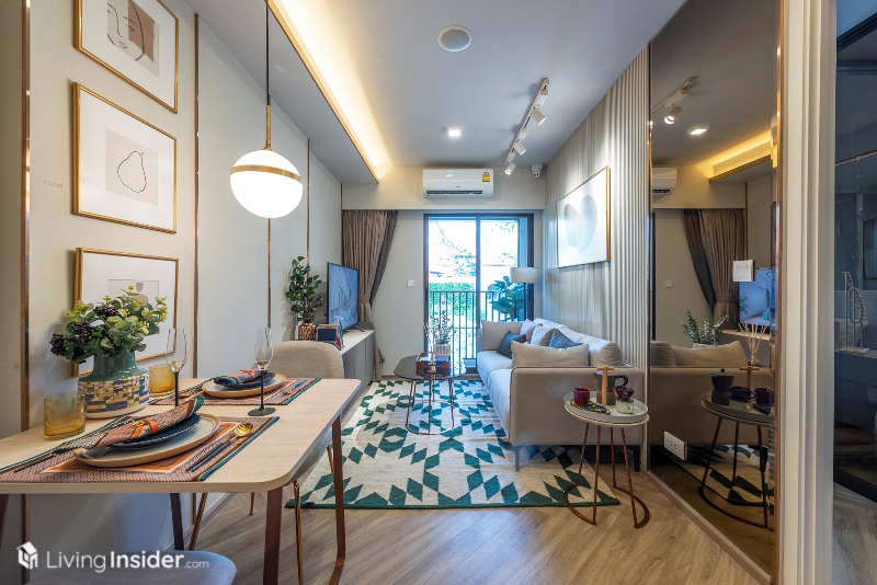 ส่วนพื้นที่นั่งเล่นมีขนาดกว้างกว่า 1-Bedroom เช่นเดียวกัน สามารถจัดโต๊ะทานอาหารได้ 4 ที่นั่ง จัดวางโซฟาแบบ L-Shape พร้อมโต๊ะกลาง ชั้นวางทีวี นอนเล่นดูหนัง เทควิวได้ถึง 2 ด้าน ในส่วนตรงนี้สามารถเปิดออกเชื่อมกับระเบียงห้องนอนเล็กได้ด้วย โดยการออกแบบได้เลือกใช้พื้นลายก้างปลาเช่นเคย ช่วยยกระดับความหรูหราเพิ่มมิติให้กับห้อง