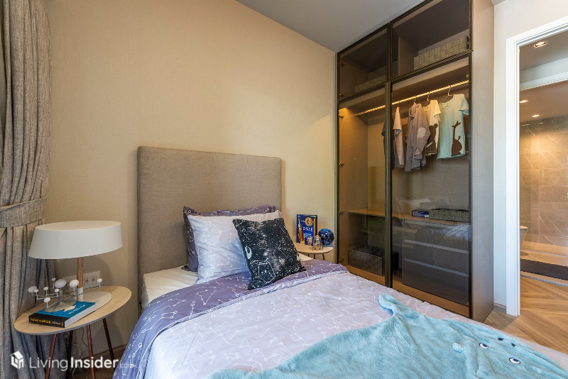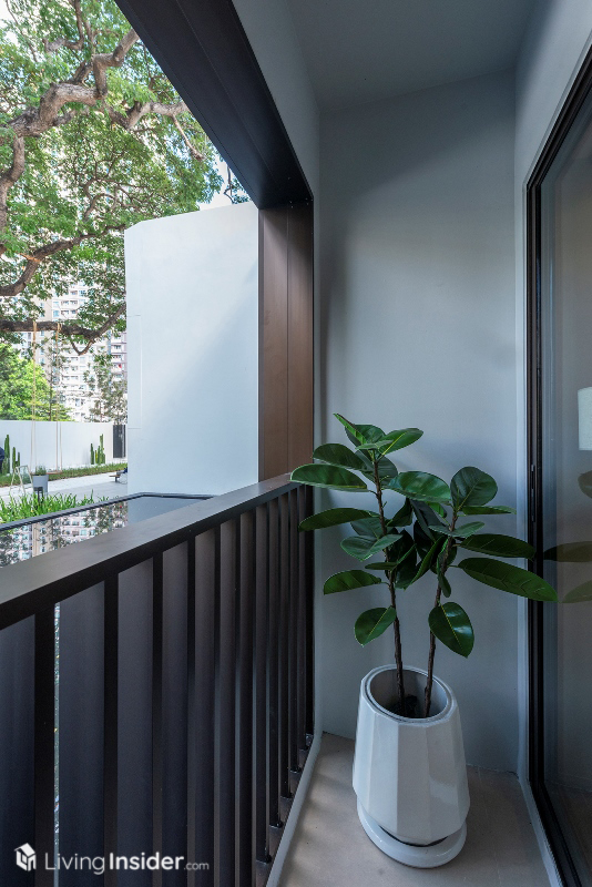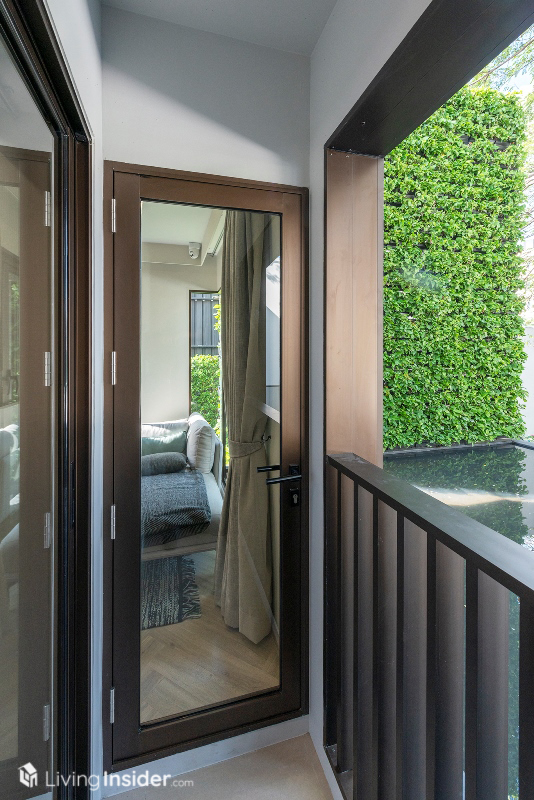 ปิดท้ายห้องนอนเล็ก สามารถจัดวางเตียง 3.5 ฟุต โต๊ะข้างเตียง และตู้เสื้อบานกระจก แถมยังมีระเบียงส่วนตัวในห้องให้ออกไปรับแดด รับลมช่วงเช้าได้อีกด้วย