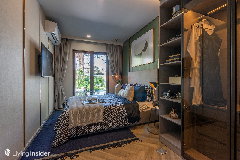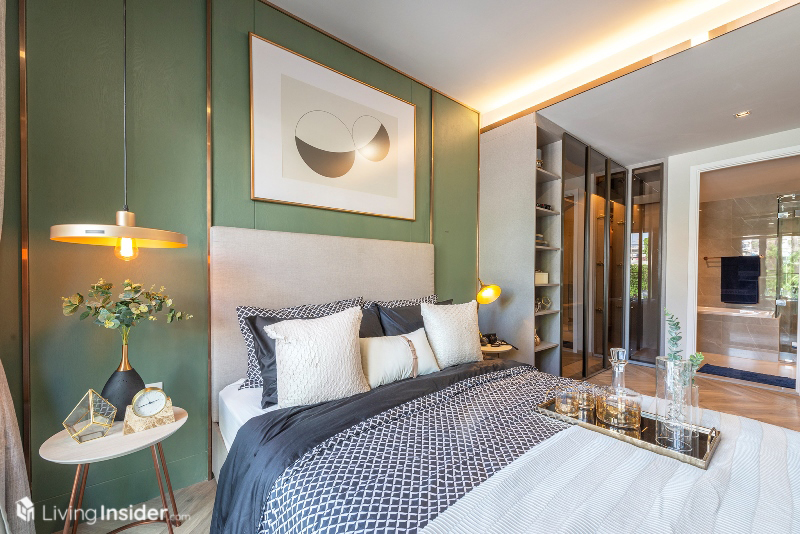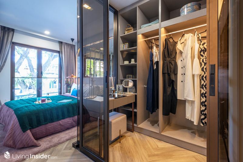 Master Bedroom ให้ความเป็นส่วนตัวสูง วางเตียงขนาด 5 ฟุต แขวนทีวีผนังได้ พร้อม Walk-In Closet บิวท์อินชนเพดาน ไม่มีบานเลื่อนกระจกกั้นเป็นห้อง แต่มีชั้นวางของ ใส่เสื้อผ้าเพิ่มให้