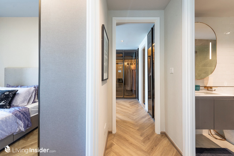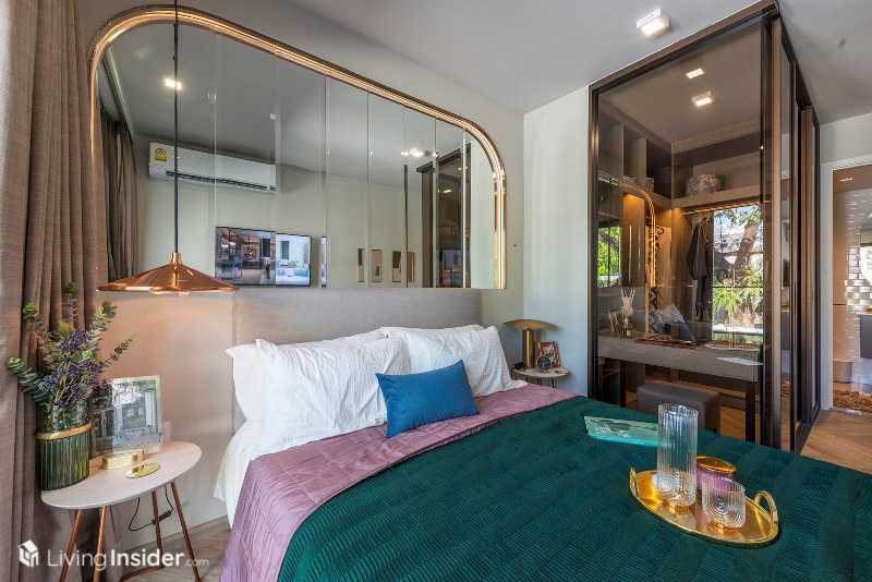 ยูนิต 1-Bedroom มาตรฐานโครงการ แบ่งสัดส่วนชัดเจน เป็นครัวปิดอยู่ด้านหน้า ถัดไปด้วยพื้นที่นั่งเล่น ห้องนอน และห้องน้ำภายใน และลองสังเกตดู ทุกยูนิตจะเน้นพื้นที่แต่งตัว (Walk-In Closet) กว้างเป็นพิเศษ ซึ่งเชื่อว่าส่วนนี้จะเป็นจุดขายสำหรับสาวๆ ที่ต้องชอบแน่นอน