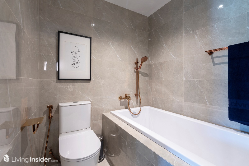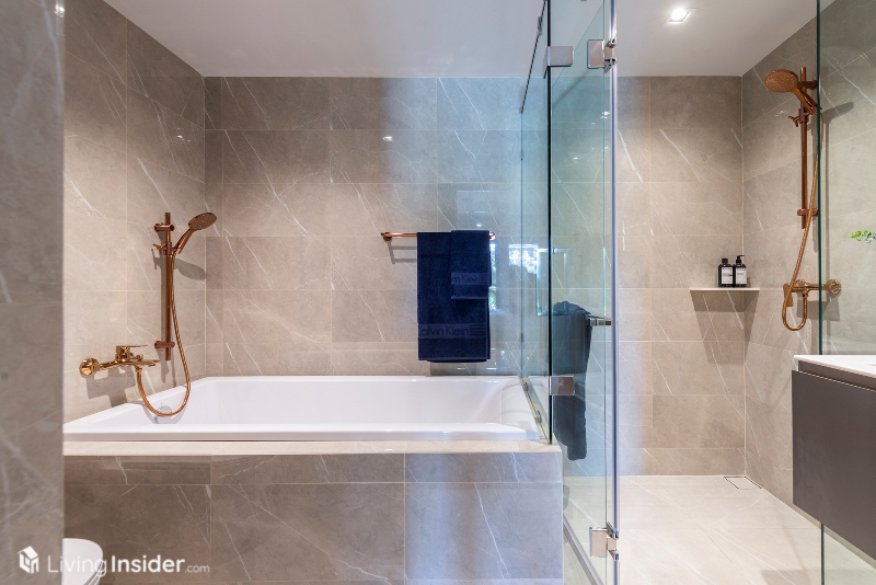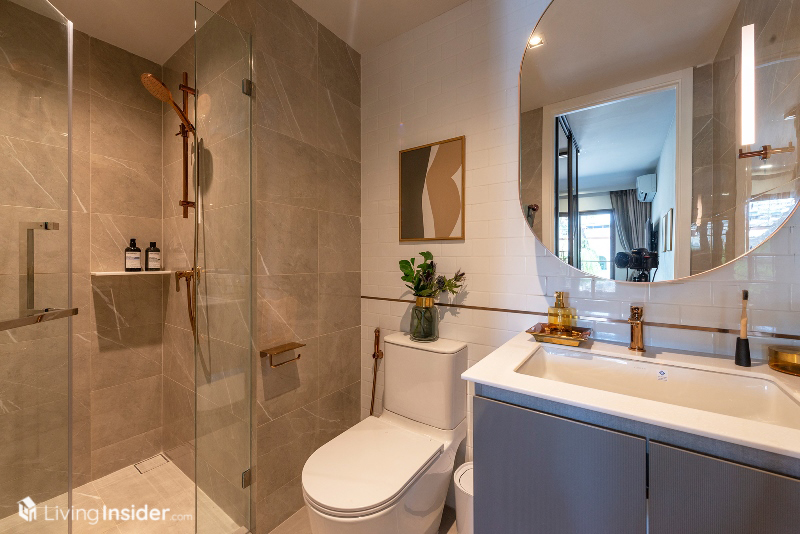 ห้องน้ำกรุผนัง - พื้นกระเบื้อง กระจกเงามีที่เก็บของด้านหลัง พร้อมตู้เก็บของใต้อ่างล้างหน้า ฉากกั้นอาบน้ำกระจก ผักบัวอาบน้ำ ซึ่งทาง Pruksa สั่งทำพิเศษสี Rose Gold หรูหราทีเดียว