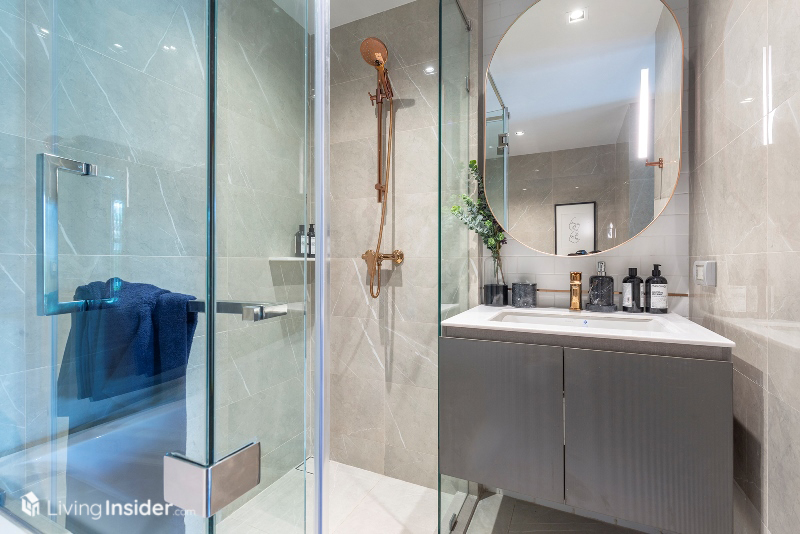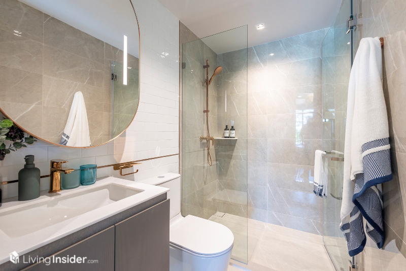 ห้องน้ำส่วนกลาง ฟังก์ชั่นเหมือน 1-Bedroom ครับ ตู้เก็บของหลังกระจกเงา - ใต้อ่างล้างหน้า ฉากกั้นกระจกนิรภัย ฝักบัวสั่งทำพิเศษ Rose Gold หรูหราดูแพงครับ