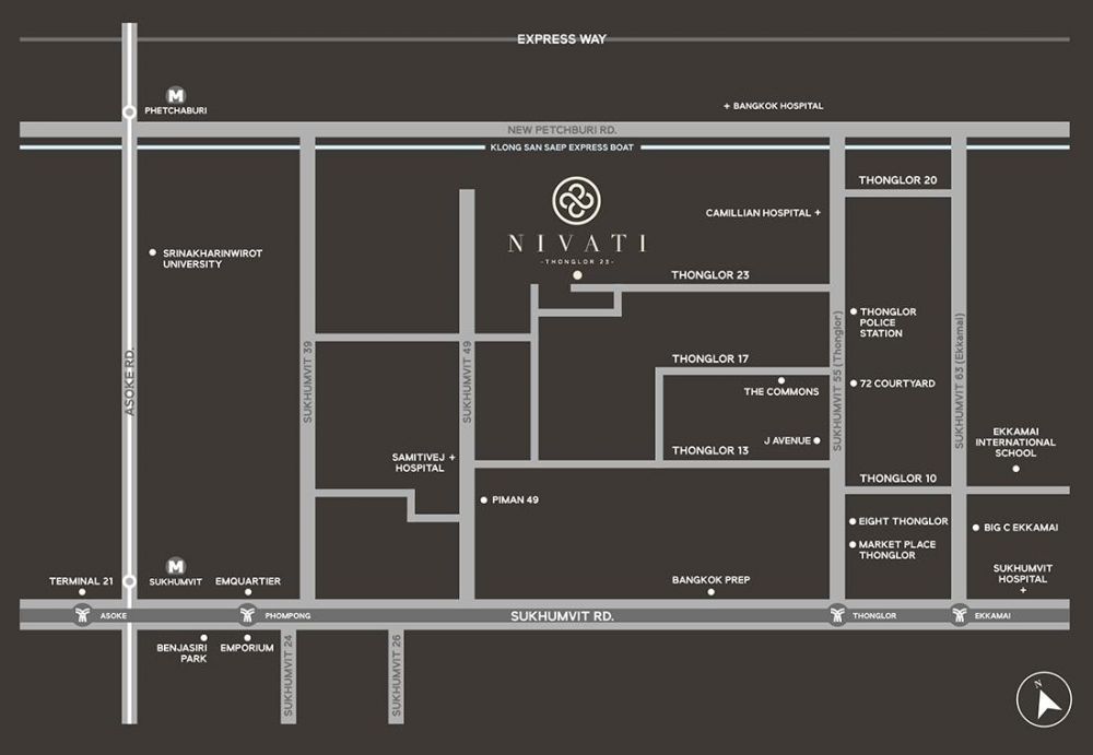 Nivati ทองหล่อ 23 อยู่ภายใน ซ.ทองหล่อ 23 ห่างจากถนนใหญ่ราว 350 ม. ข้อดีคือความ ‘สงบเป็นส่วนตัว’ เพราะเป็นซอยตันและตัวโครงการอยู่เกือบท้ายซอย ทำให้รถไม่วิ่งพลุกพล่าน แต่ก็ยังสามารถลัดเลาะออก ซ.สุขุมวิท 39 (พร้อมพงษ์) - สุขุมวิท 49 ที่อยู่ก่อนถึงโครงการได้ ขับรถส่วนตัวสบายๆ แต่ไกลจาก BTS สถานีทองหล่อนิดนึง ประมาณ 2 กม.