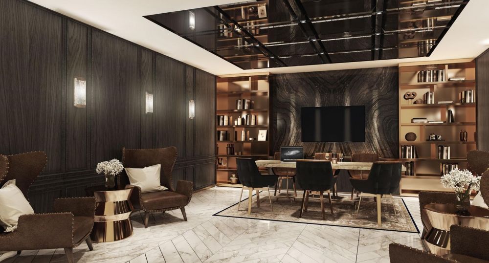 ถัดมาคือ Business Lounge สำหรับนั่งพูดคุย จิบชายามบ่าย ตกแต่งโทนสีดำ-น้ำตาลเข้ม กรุผนังด้วยไม้ Dark Oak และหินอ่อน (Black Forest) ให้ความรู้สึกเคร่งขรึม แต่อบอุ่นเป็นอย่างดี