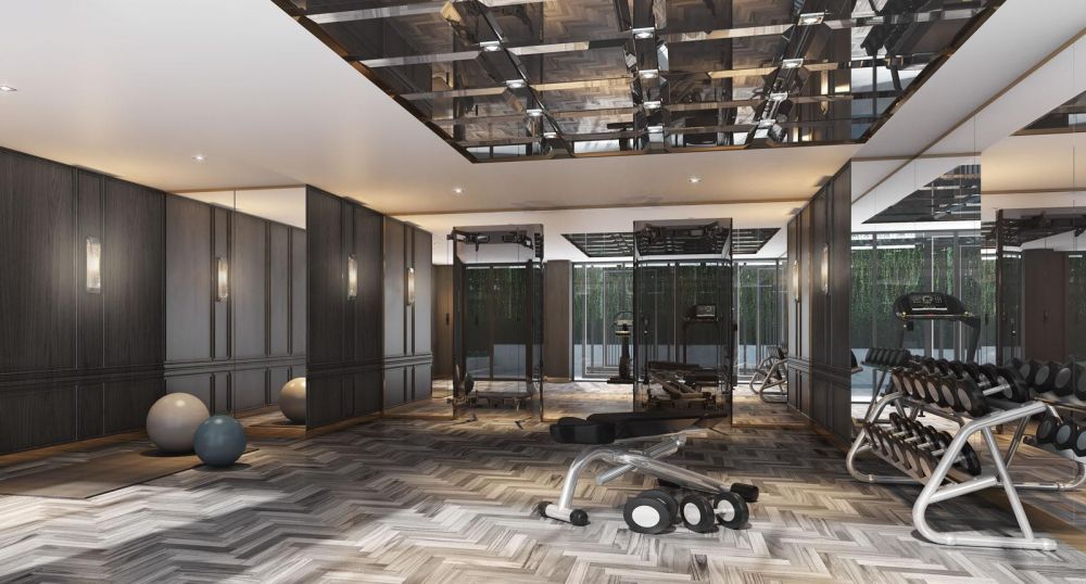 Fitness Room ตกแต่งอย่างเรียบง่าย ปูพื้นลาย Herringbone ขนาดไม่ใหญ่มากนัก เทควิวสระว่ายน้ำเช่นเดียวกับ Main Lobby