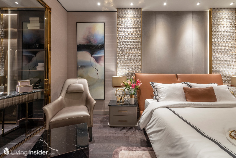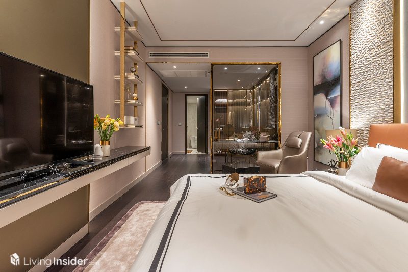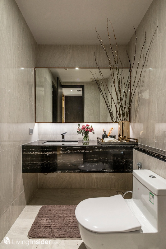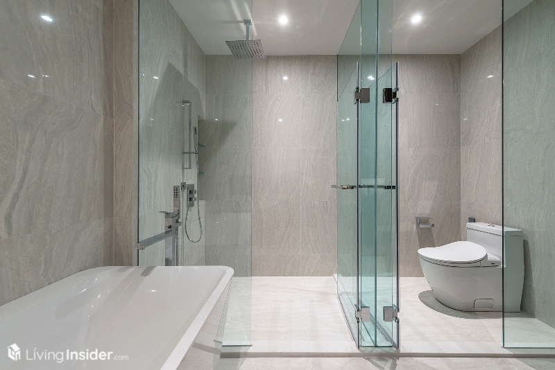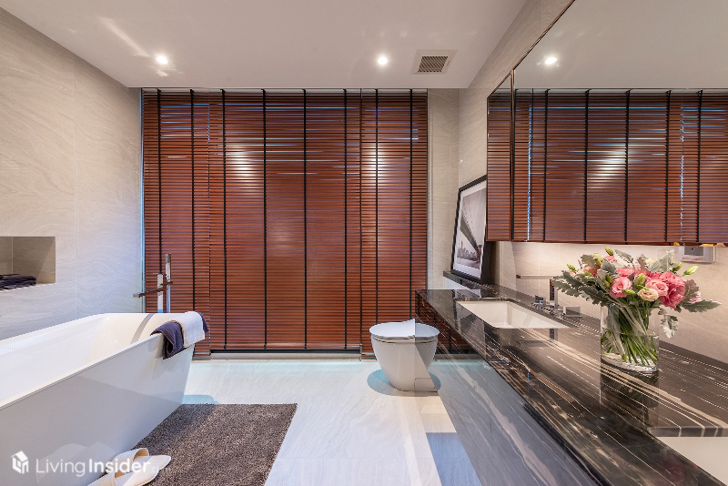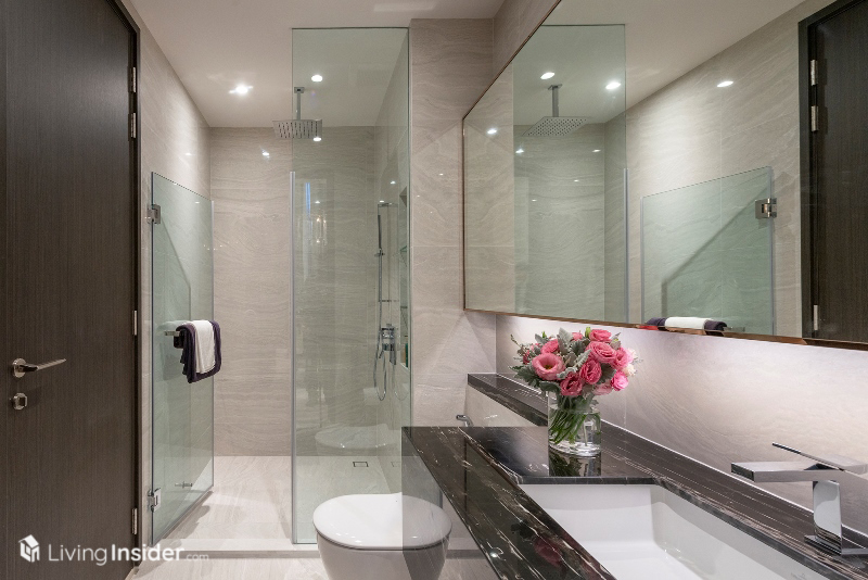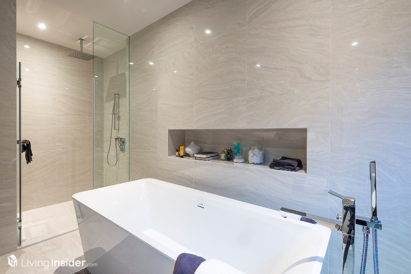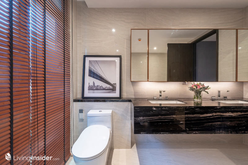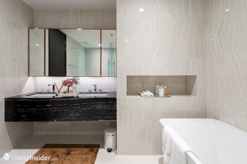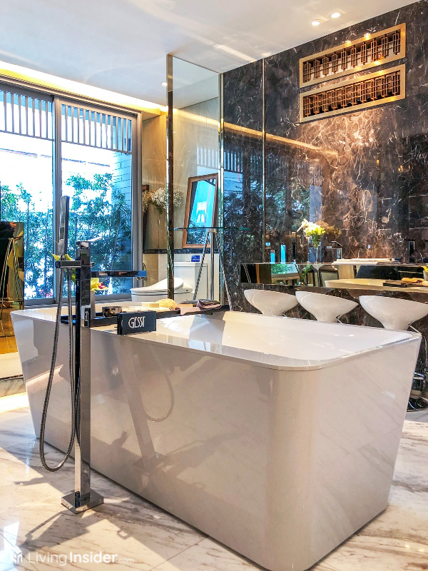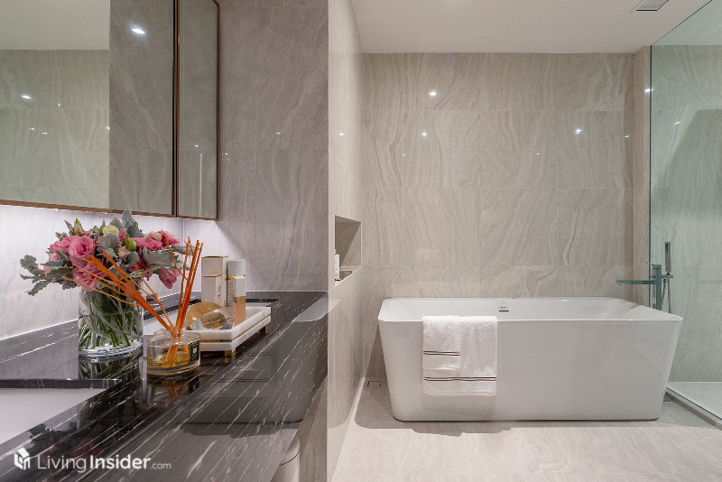 และห้องน้ำ แบ่งอ่างล้างหน้าเป็น His & Her พร้อมอ่างอาบน้ำ - สุขภัณฑ์จาก Villeroy & Boch เป็นระบบกึ่งอัตโนมัติ มีรีโมทกดฟังก์ชั่น ก๊อกน้ำ Gessi จากแบรนด์อิตาลี โดดเด่นด้านดีไซน์ มีขั้นตอนการผลิตที่ใส่ใจในทุกชิ้นส่วน โดยรุ่นที่โครงการให้ลูกค้าเป็นเกรดพรีเมียม ที่นำทองเหลือง 1 ชิ้น มาผลิตเป็นงานแบบไร้รอยต่อ ซึ่งงานผลิตคุณภาพสูงนี้ จะทำให้ระบบการไหลของน้ำจากก๊อกมีความสม่ำเสมอ คุณภาพคงทน ใช้งานได้ดีกว่าในระยะยาว ควบคุมอุณหภูมิในตัว (Thermostatic) และส่วนยืนอาบฝักบัว Rain Shower