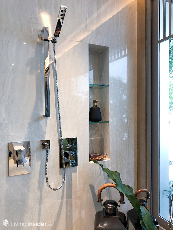ตัวก๊อกน้ำแบรนด์ Gessi จากอิตาลี ซึ่งเหตุผลที่โครงการเลือกแบรนด์นี้ นอกจากเป็นของเกรดพรีเมียมแล้ว เรื่องการดีไซน์ก็โดดเด่น และขั้นตอนการผลิตที่ใส่ใจทุกรายละเอียด คุณภาพแข็งแรง ใช้งานได้ยาวนาน ระบบการไหลของน้ำจากก๊อกมีความสม่ำเสมอ และสามารถควบคุมอุณหภูมิในตัว (Thermostatic) และส่วนยืนอาบฝักบัว Rain Shower