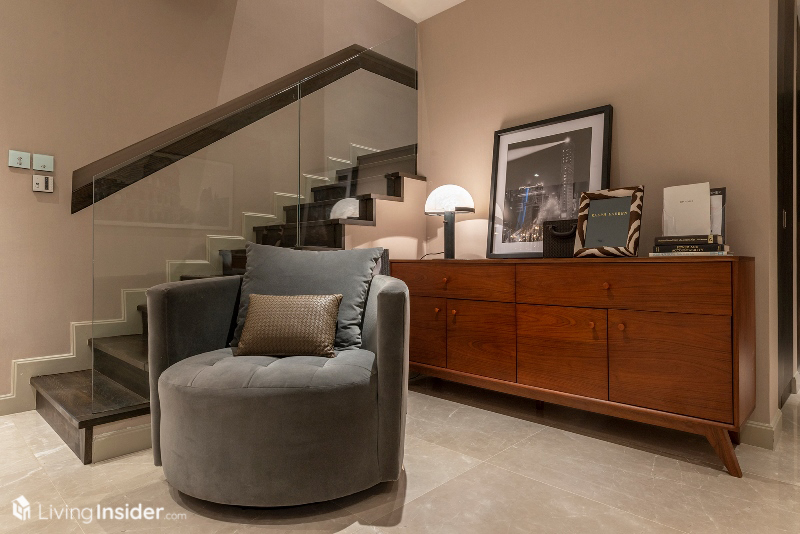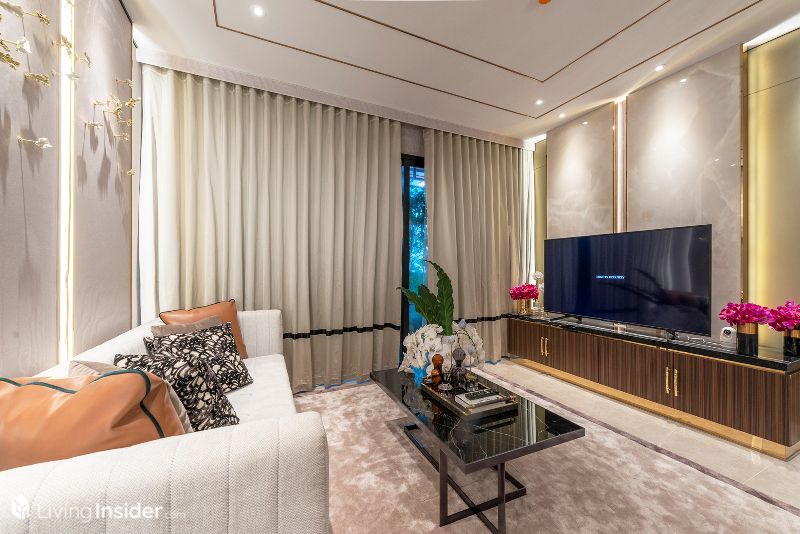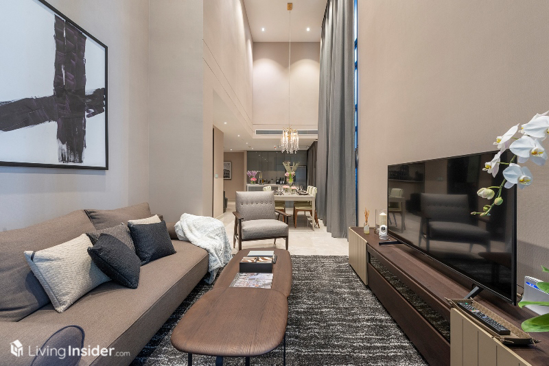 เปิดเข้ามาพบกับส่วนนั่งเล่น จัดชุดโซฟา 2 ที่นั่ง โต๊ะกลาง เก้าอี้พักผ่อน ระยะห่างจากทีวีราว 3 ม. โดยจากพื้นถึงเพดานในส่วนของห้องนั่งเล่นนนี้ จะสูงเกือบ 6 ม. เลยทีเดียว แต่ในส่วนของห้องอื่นๆ ความสูงจะอยู่ที่ 2.85 ม. ที่ให้ความรู้สึกไม่แออัดเหมือนได้อยู่บ้านจริงๆ