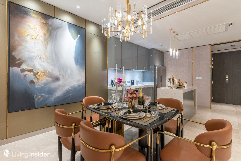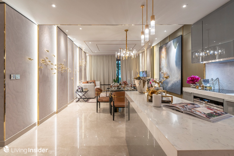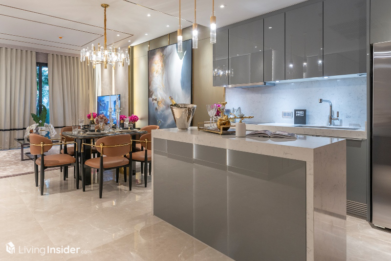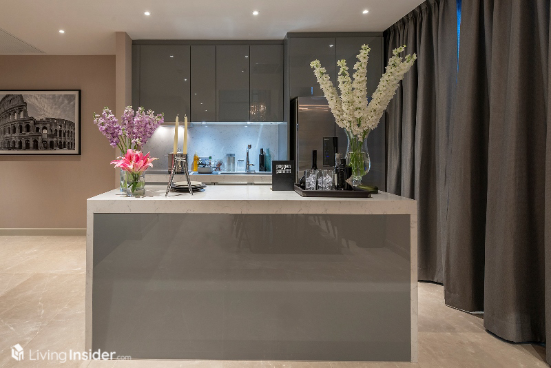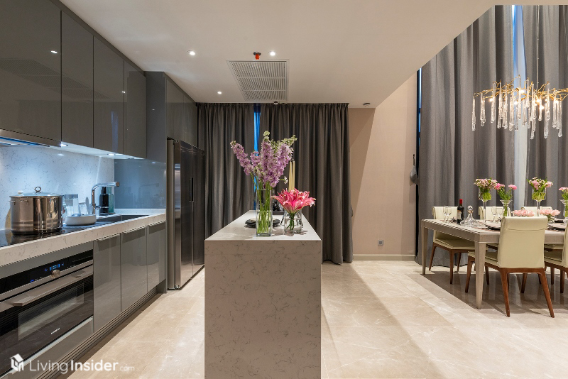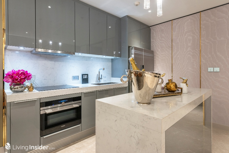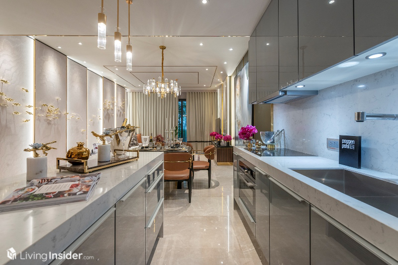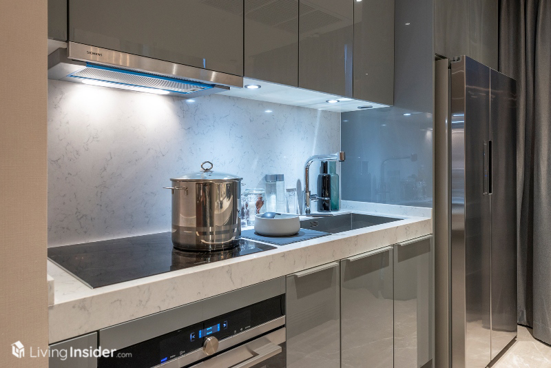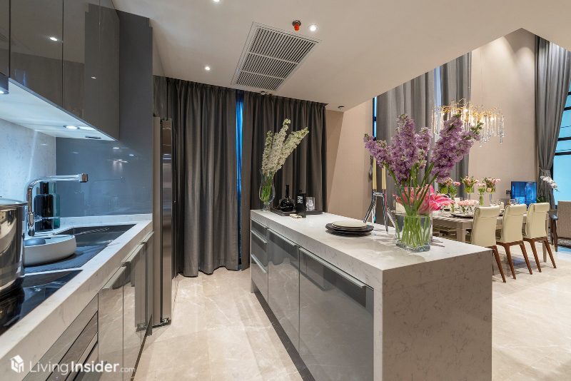 Island Kitchen ปูพื้นด้วยหินอ่อน Italian Grey บิวท์อินครัวได้ตามห้องตัวอย่างเลย Top หินควอตซ์, หน้าบาน Gloss ให้ ชุดเครื่องครัวแบรนด์ Poggenpohl ซึ่งเป็นแบรนด์เก่าแก่ที่สุดจากเยอรมัน และเก่าแก่ที่สุดในโลก ที่สำคัญคือ ชิ้นส่วนทั้งหมดสั่งทำพร้อมประกอบจากโรงงานที่นั่นเลย, ซิงค์หลุม Blanco และก๊อกน้ำแบรนด์ Dornbracht ส่วน Hobs & Hood, เตาอบ - เตาไฟฟ้า ใช้ของ Siemens
