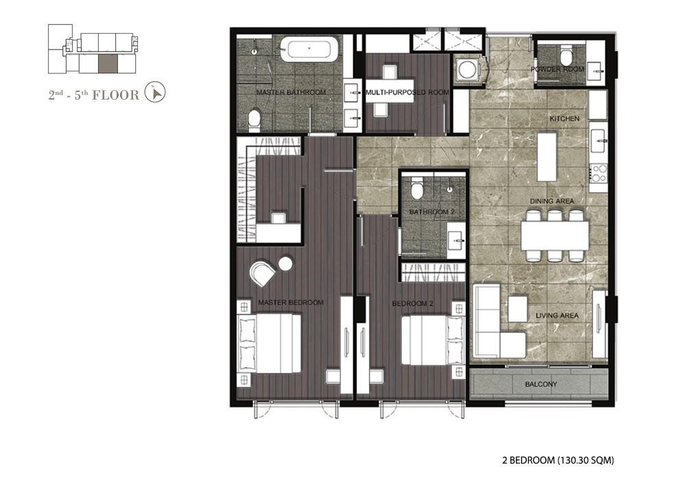 Layout คล้ายกับ 2-Bedroom โครงการอื่นๆ เน้นพื้นที่ Living เป็นหลัก มี Master Bedroom, ห้องนอนเล็ก เพิ่มเติมห้องอเนกประสงค์ เหมาะกับอาศัยแบบครอบครัว 2-4 คน