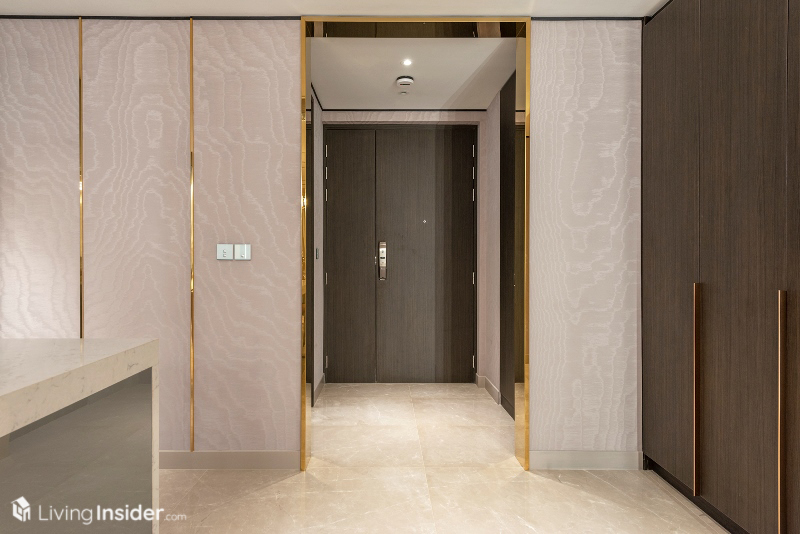 ขวามือเป็นพื้นที่ครัว (Island Kitchen) มี Counter กลางสำหรับเก็บของใช้ - เตรียมอาหาร ชุดเครื่องครัวแบรนด์ Poggenpohl อย่างที่บอกไปข้างต้นว่าเป็นแบรนด์ระดับโลก, ซิงค์หลุม Blanco, ก๊อกน้ำแบรนด์ Dornbracht ส่วน Hobs & Hood เตาอบ - เตาไฟฟ้า ใช้ของ Siemens เช่นเดียวกับยูนิตก่อนหน้า