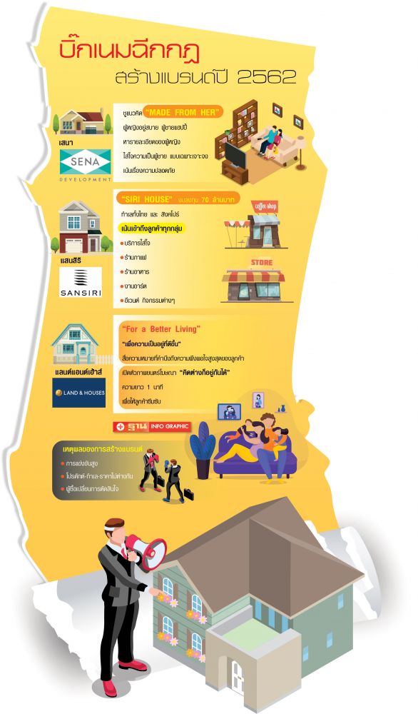 นอกจากรายใหญ่ต้องเฟ้นหาที่สุดของทำเล พัฒนาโปรดักต์ให้คุณภาพทิ้งห่างเพื่อรักษายอดขายแล้ว การสร้างแบรนด์ให้เป็นที่จดจำเข้าถึงลูกค้ากลุ่มเป้าหมายผ่านกลยุทธ์แตกต่างกันยิ่งเป็นสิ่งจำเป็น เพราะถือเป็นโอกาสที่อาจส่งผลถึงการตัดสินใจของ "ว่าที่ลูกค้า" ซื้อบ้านและคอนโดฯ ของตนเองในอนาคต โดยเฉพาะช่วงมาตรการรัฐบังคับใช้