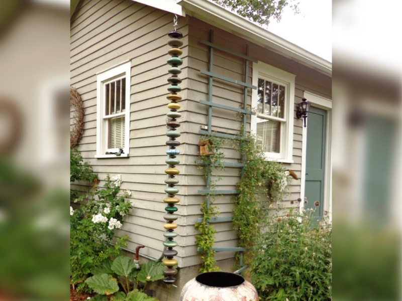 รางน้ำฝนแบบสุดท้ายนี้อาจดูแปลกตาไปซักนิดนึงนะครับ เพราะมันไม่ใช่ท่อน้ำแบบที่เคยเห็นกัน แต่จะเป็นการใช้ก้อนหินคละขนาดร้อยกันเป็นสายในแนวตั้งแล้วปล่อยห้อยลงมาจากปลายรางน้ำฝนบนหลังคา ซึ่งมันก็ทำหน้าที่เหมือนกับรางน้ำฝนนั่นหละครับ เพราะน้ำก็จะไหลมาตามสายหินร้อยเหล่านั้น ลงสู่สวนเล็กๆ ที่เราจัดไว้ด้านล่าง จึงเป็นภาพที่สวยงามมองเพลินๆ ได้เลยครับ