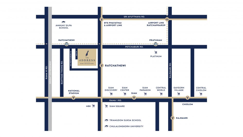 The Address สยาม-ราชเทวี ตั้งอยู่บนโลเคชั่นที่เรียกได้ว่า มีทั้งมูลค่าและคุณค่าที่สุดของใจกลางเมือง ในย่านสยามอย่าง “ราชเทวี” บนถนนเพชรบุรี ติดปากซอยเพชรบุรี 14 ไม่ต้องเข้าซอยให้ยุ่งยาก ใช้รถยนต์ส่วนตัวก็สะดวก สามารถออกพระราม 4 หรือเข้าซอยเพชรบุรี12 ทะลุไปพญาไท รวมถึงอนุสาวรีย์ หรือจะวิ่งไปพระราม 8 ประตูน้ำก็ได้เหมือนกัน แม้แต่ทางด่วนเองก็มีให้ขึ้นหลายเส้นทาง ทั้งทางด่วนศรีรัช ทางด่วนยมราช ทางด่วนบางนา-ดาวคะนอง สามารถวิ่งไปได้ทั่วกรุงเทพฯ ทุกทิศทาง หรือออกต่างจังหวัดก็ไม่ยาก